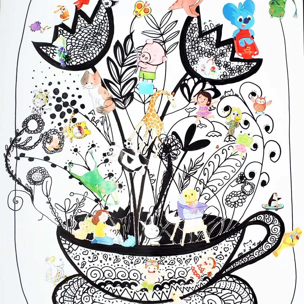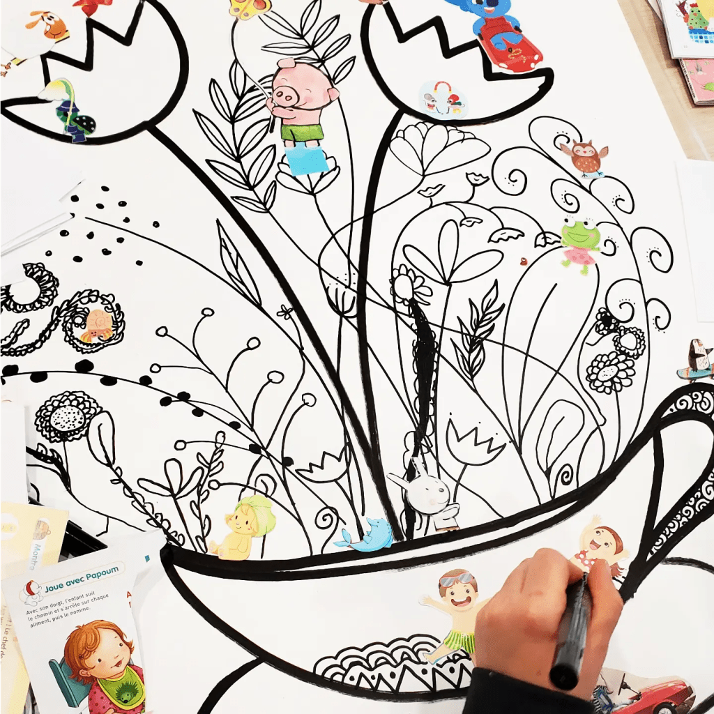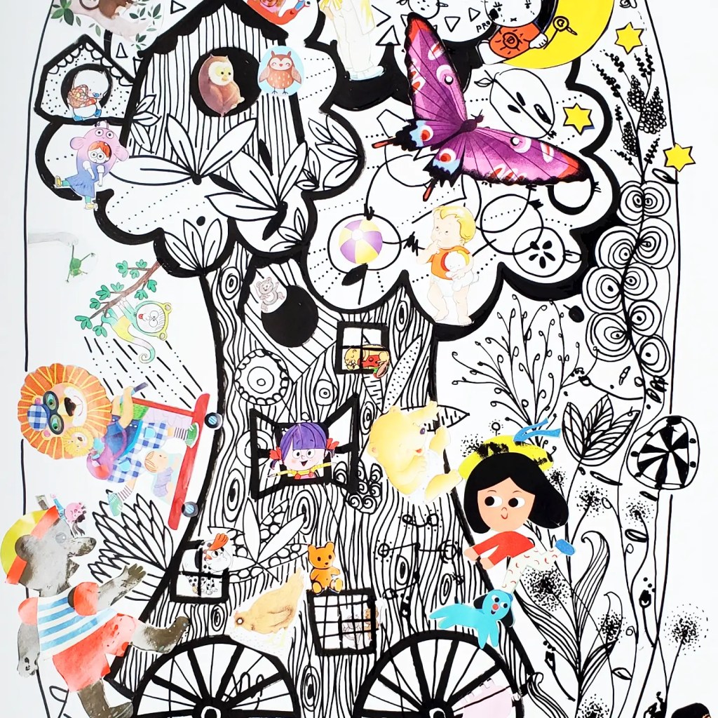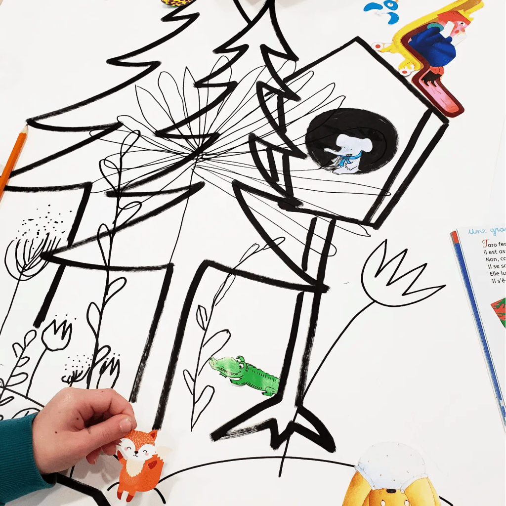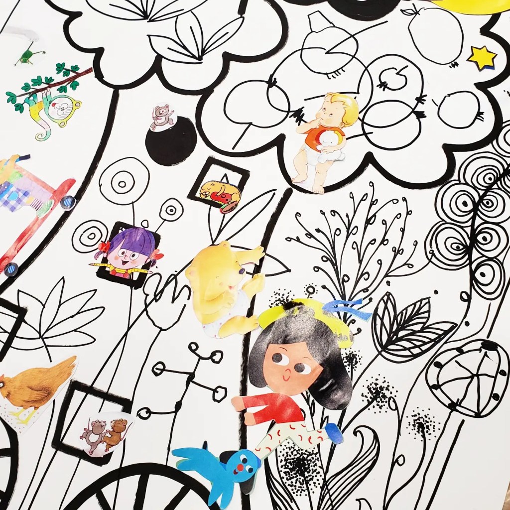 Projet collaboratif intergénérationnel à la médiathèque « La Licorne » de Grand Bourgtheroulde (27). Lors de cet atelier participatif, nous avons créé ensemble un univers imaginaire inspiré de la littérature jeunesse en peuplant ses paysages de personnages découpés dans des magazines désherbés.