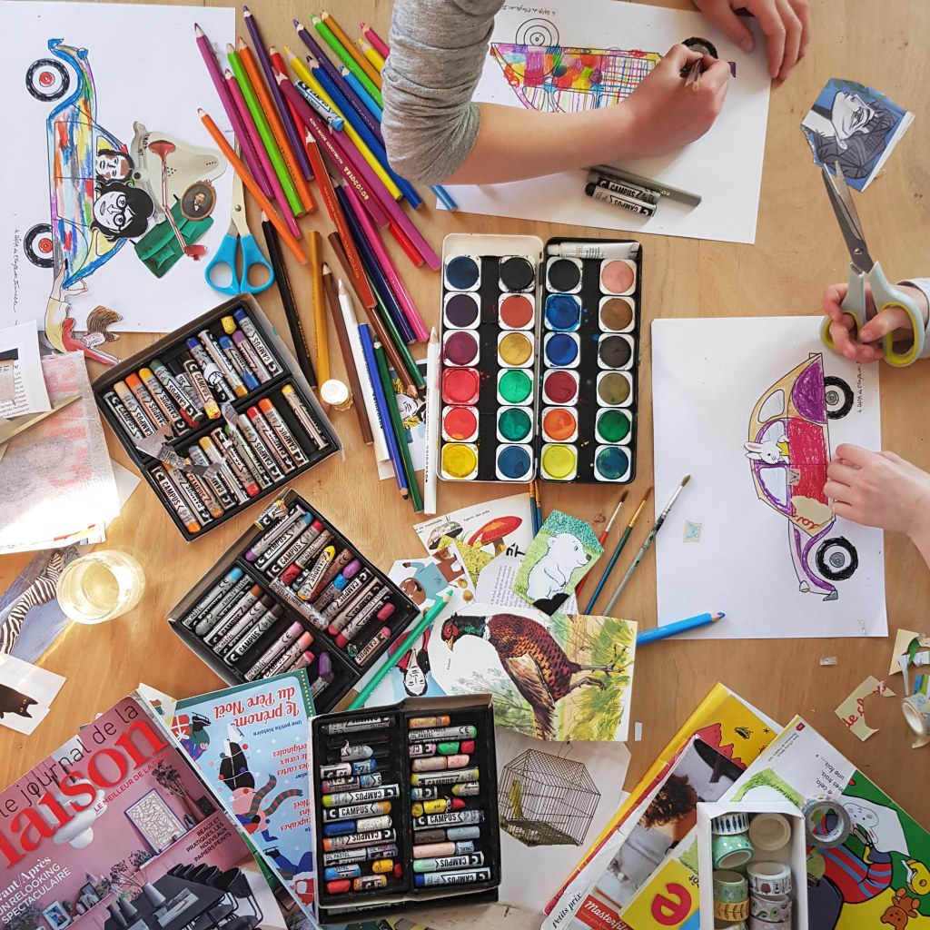 A mettre dans vos valises: des crayons de couleurs ou des pastels, de la colle, des ciseaux et de vieux magazines à découper (pour les tout petits voyageurs, vous pouvez pré-découper les images pour leur faciliter la route!). Si vous avez envie, vous pouvez aussi prendre des masking tapes et de la peinture à l’eau (à éviter ou à appliquer délicatement si vous avez une imprimante à jet d’encre, vous risquez de diluer les traits imprimés.)