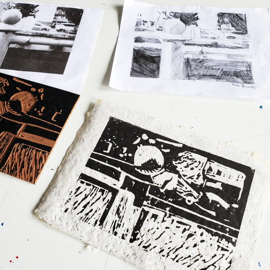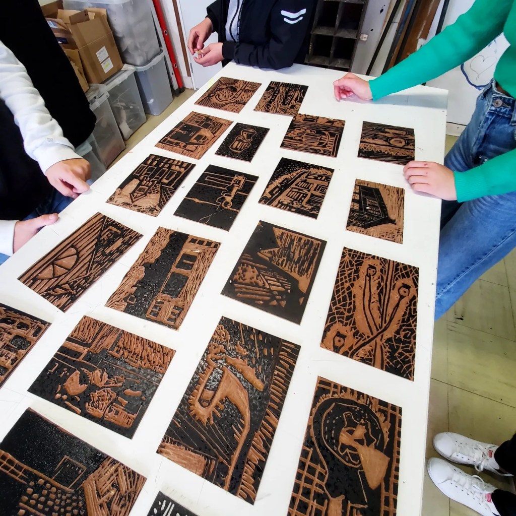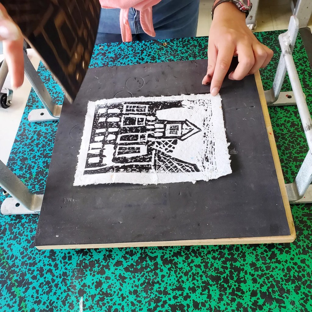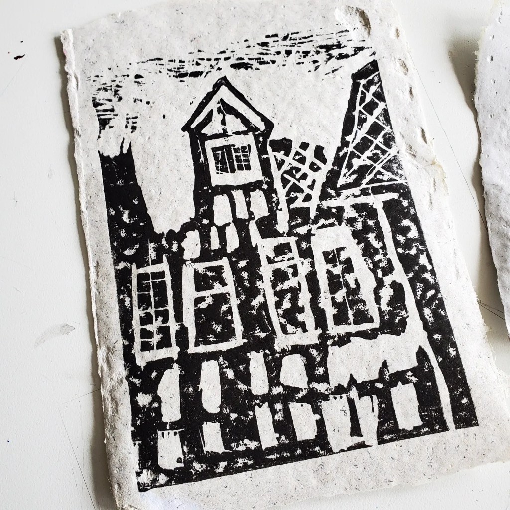 Ensemble, nous avons fabriqué du papier recyclé à partir de vieux manuels scolaires. Ensuite, les élèves ont travaillé sur des dessins de la ville pour créer leur linogravure et l’imprimer sur les feuilles qu’ils avaient fabriquées. Une exposition a ensuite été organisée à la Galerie Théroulde pour partager le travail des élèves avec un large public.