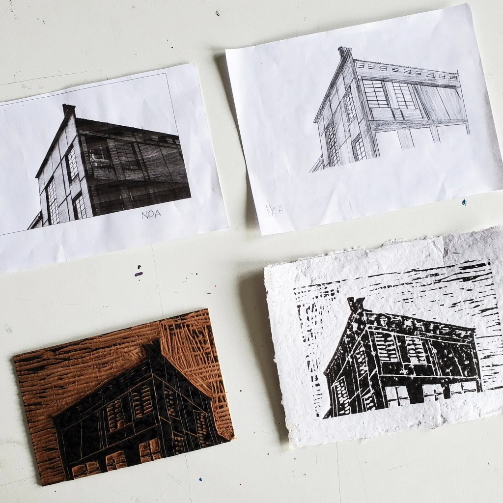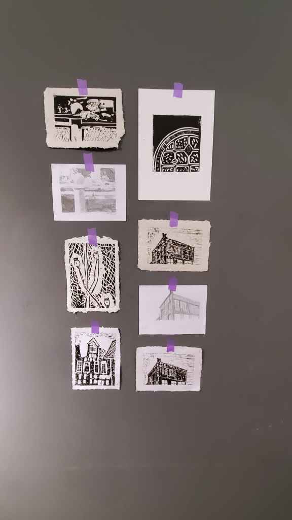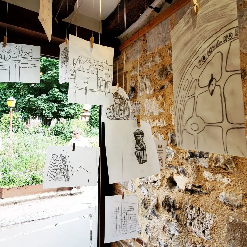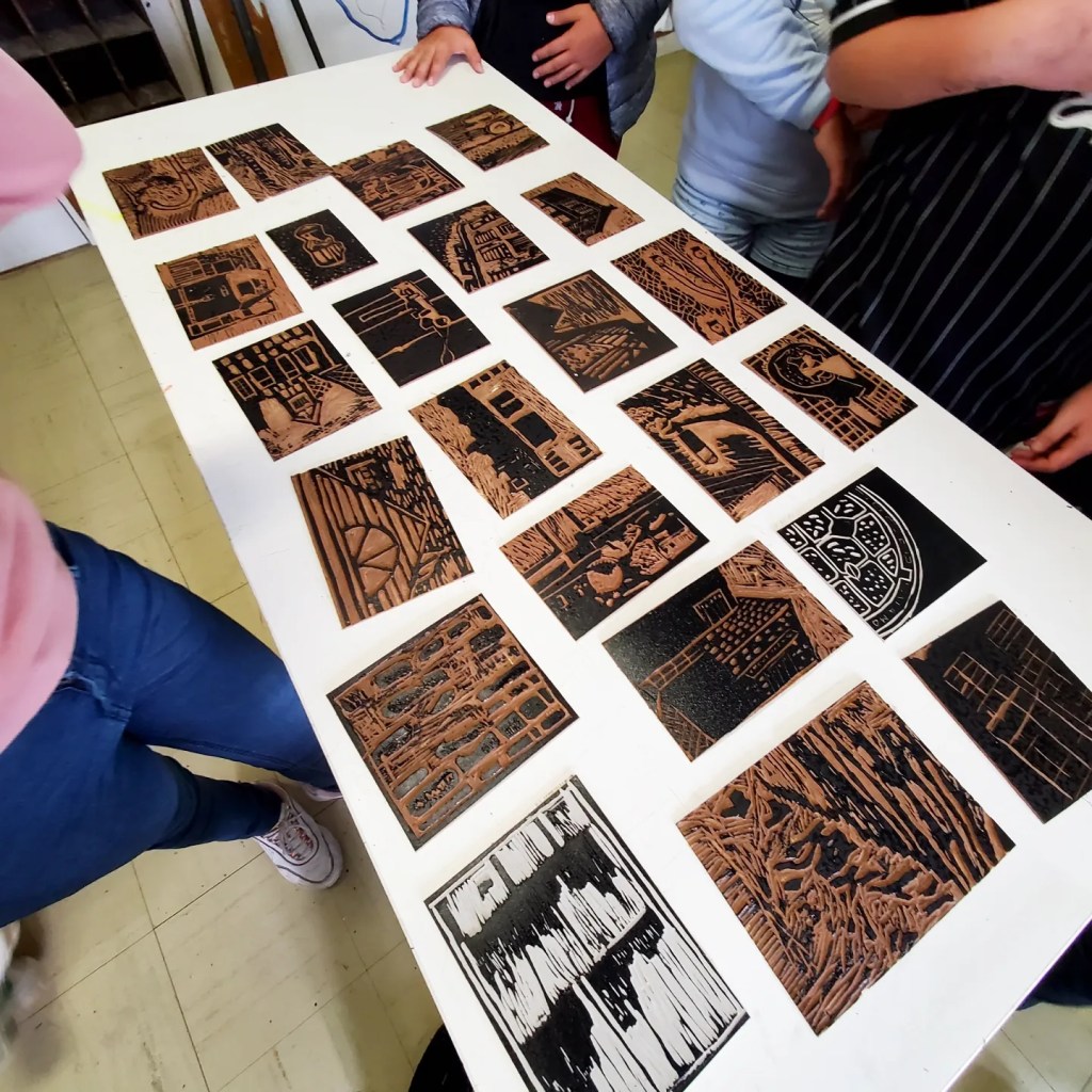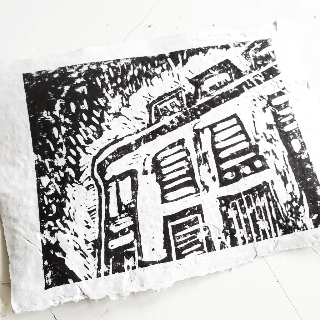 Ensemble, nous avons fabriqué du papier recyclé à partir de vieux manuels scolaires. Ensuite, les élèves ont travaillé sur des dessins de la ville pour créer leur linogravure et l’imprimer sur les feuilles qu’ils avaient fabriquées. Une exposition a ensuite été organisée à la Galerie Théroulde pour partager le travail des élèves avec un large public.