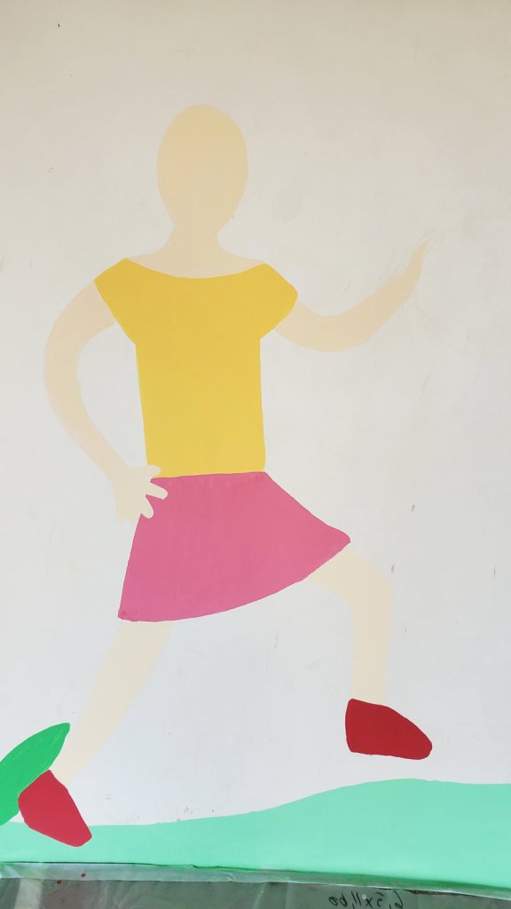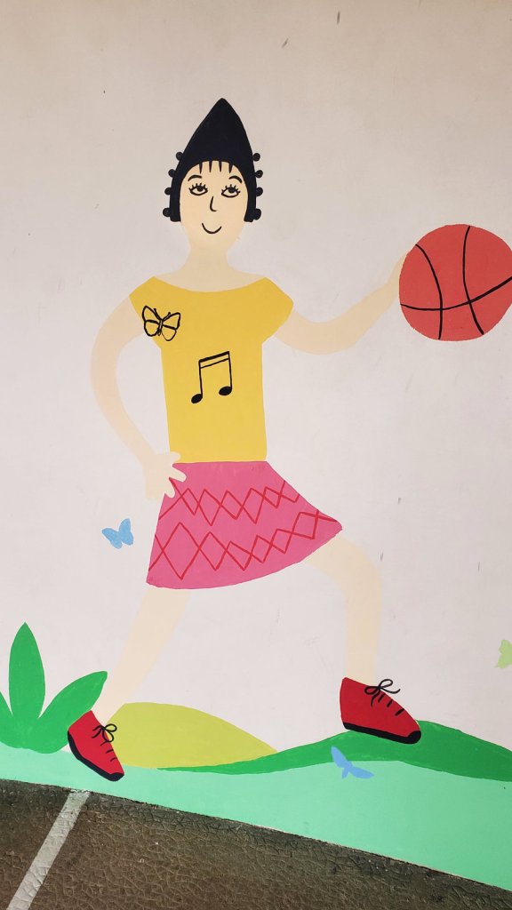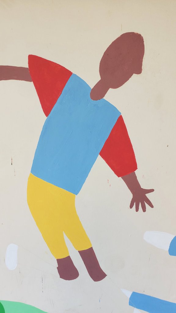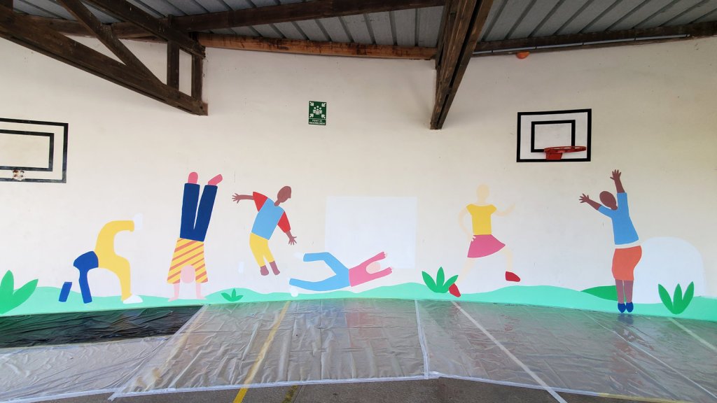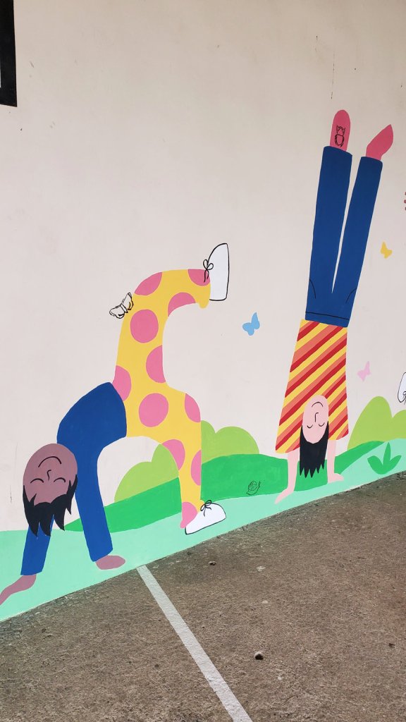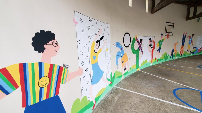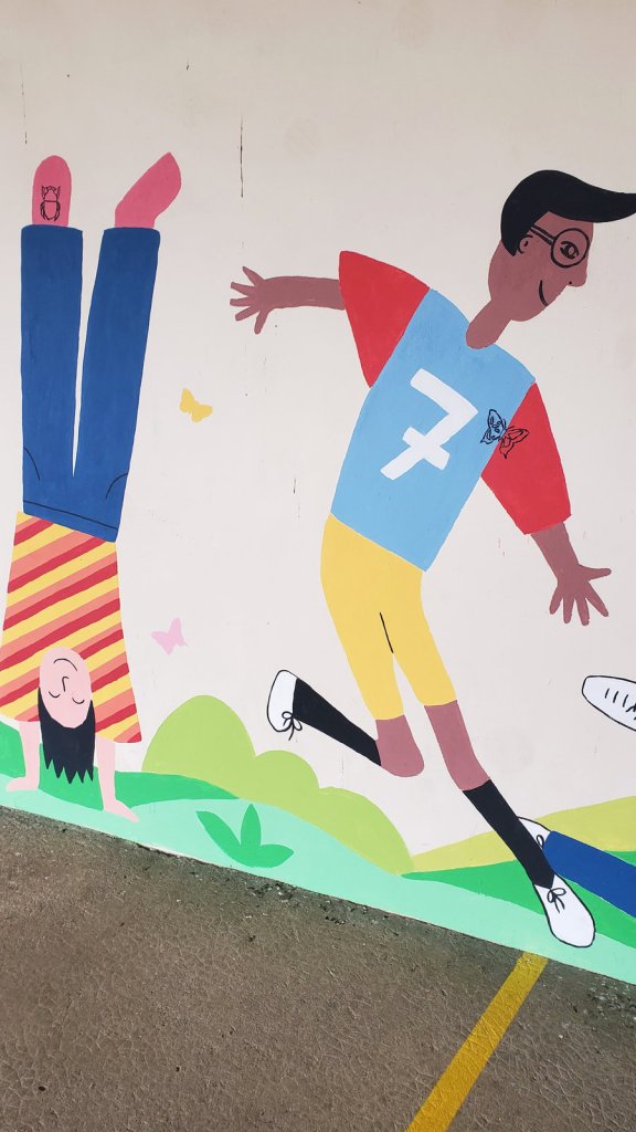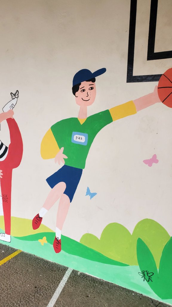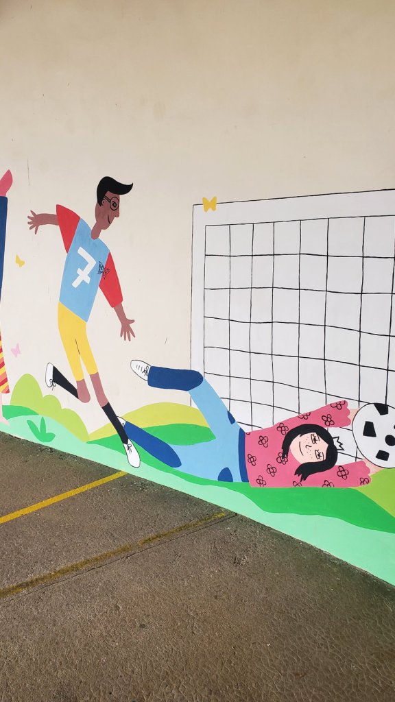 Fresque murale sur le thème du sport et du jeu, créée et réalisée avec les élèves des 7 classes de l’école élémentaire de Cagny (14).