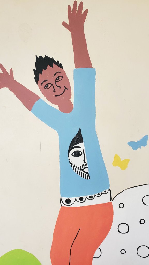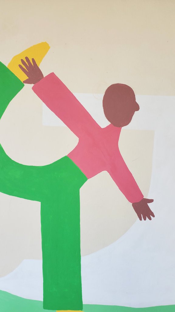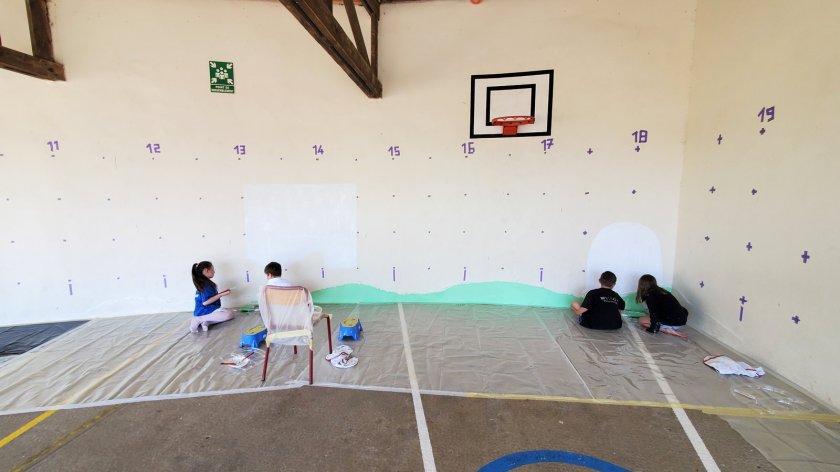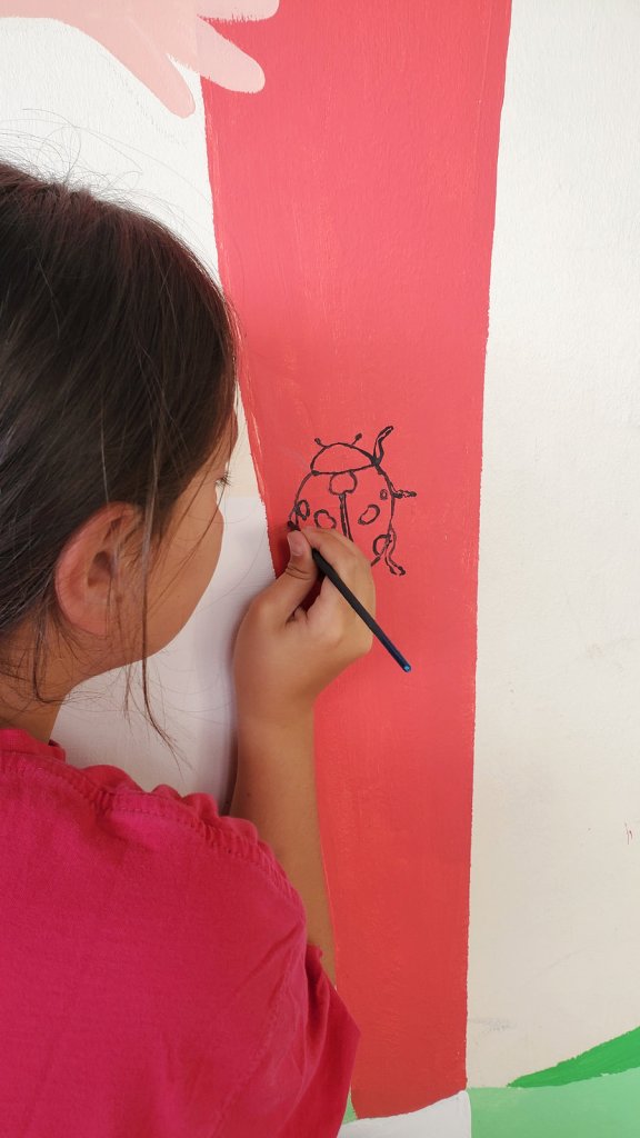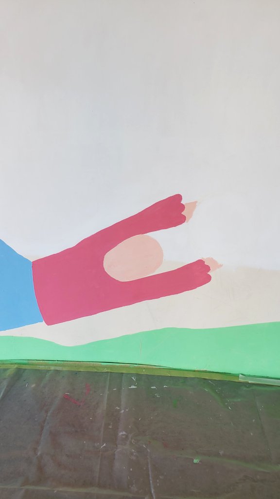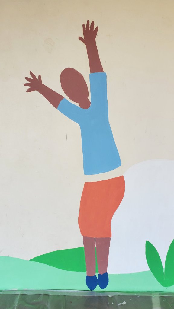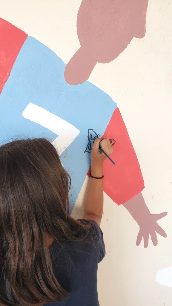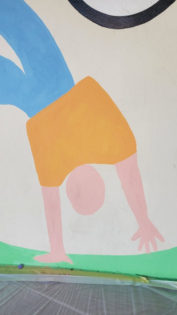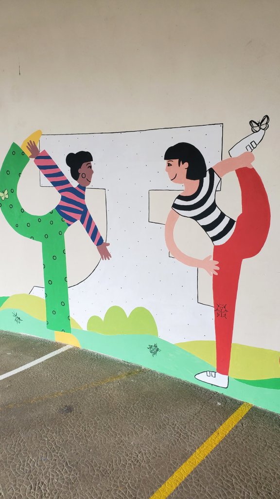 Fresque murale sur le thème du sport et du jeu, créée et réalisée avec les élèves des 7 classes de l’école élémentaire de Cagny (14).