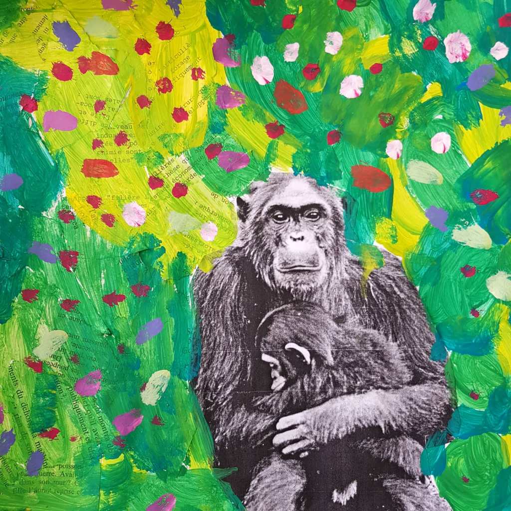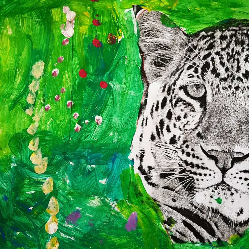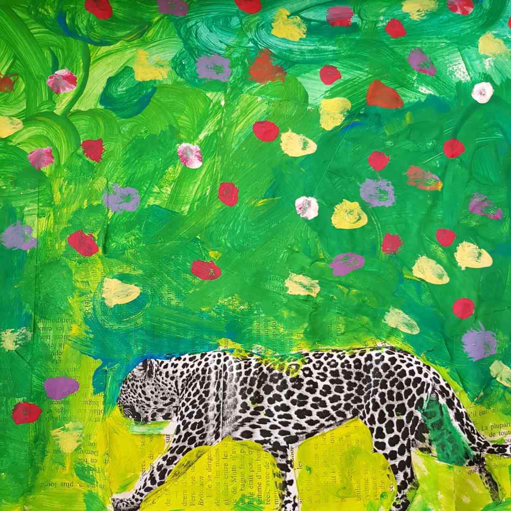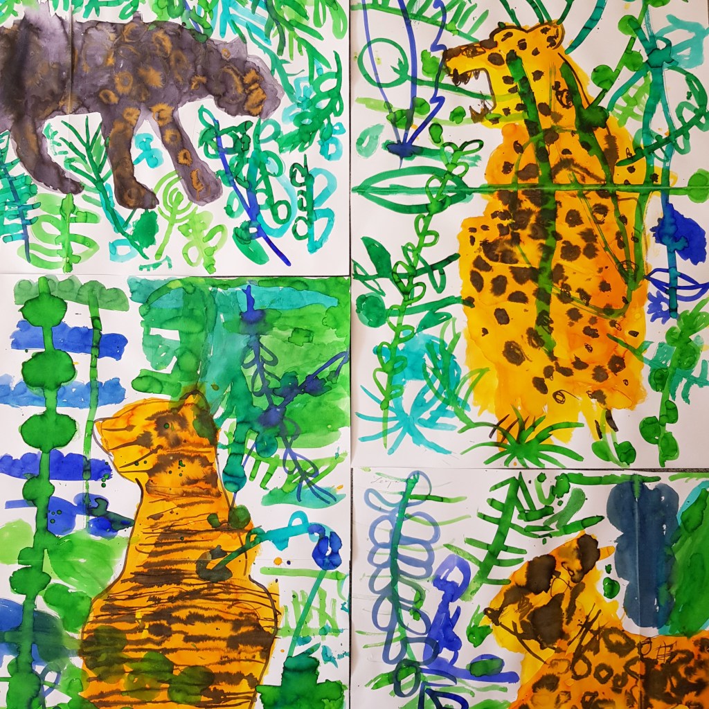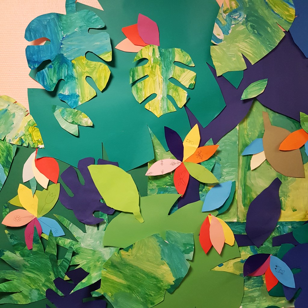 Ateliers sur le thème de la jungle proposés à l’École Élémentaire Dian Fossey à Douvres-la-Délivrandes (14). Pour une partie, les réalisations des 5 classes (TPS-CP) ont servi à imaginer la fresque sous le préau de l’école que nous avons peinte ensemble avec les enfants.