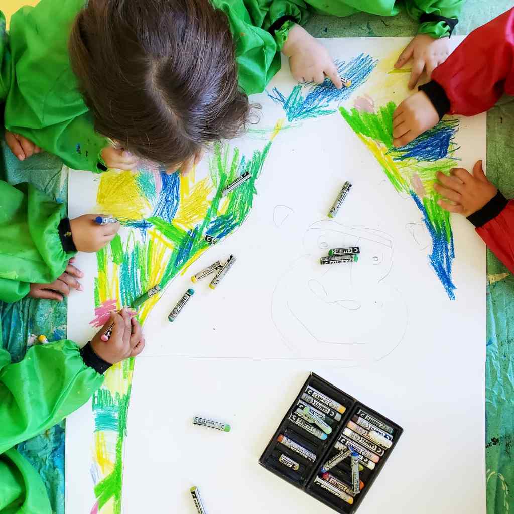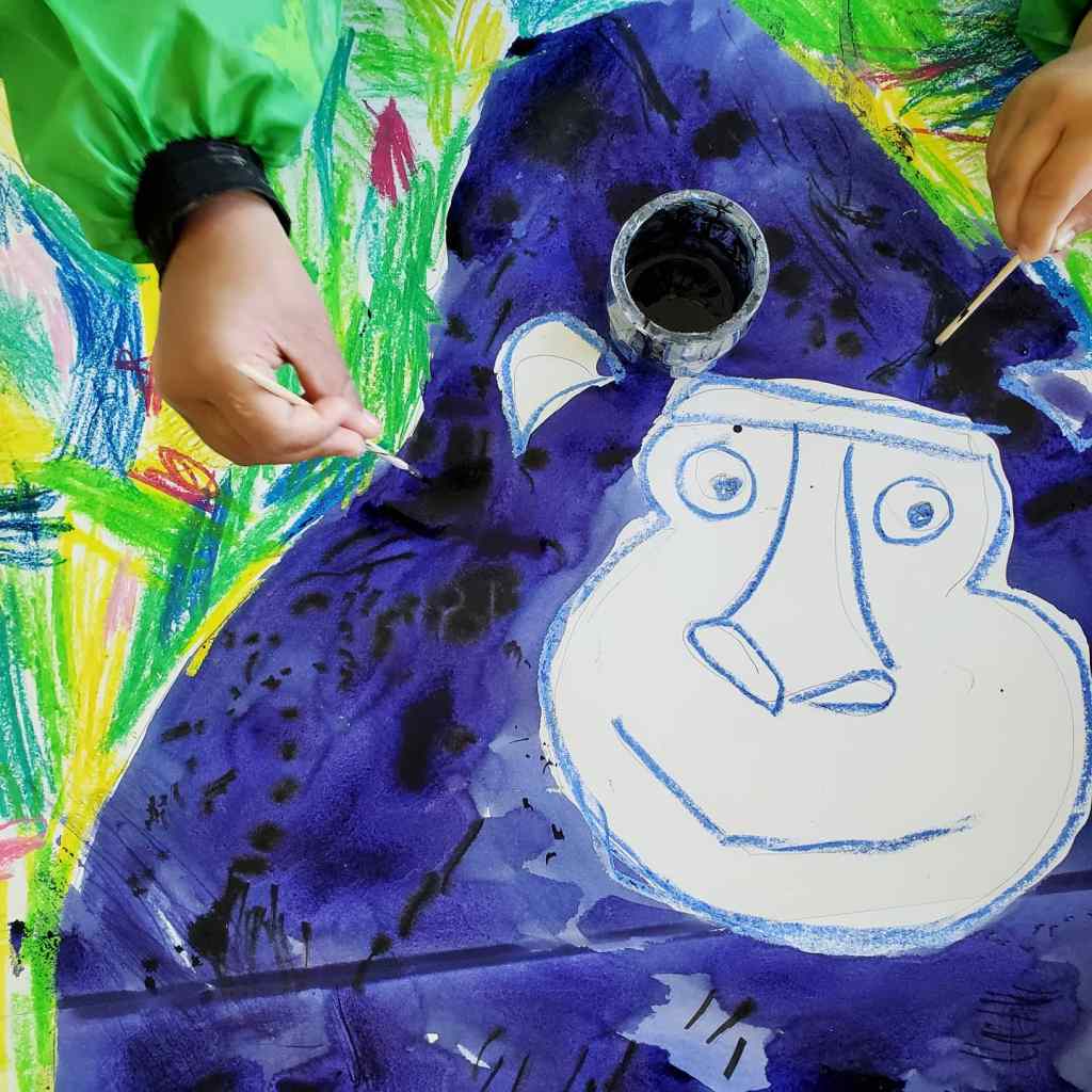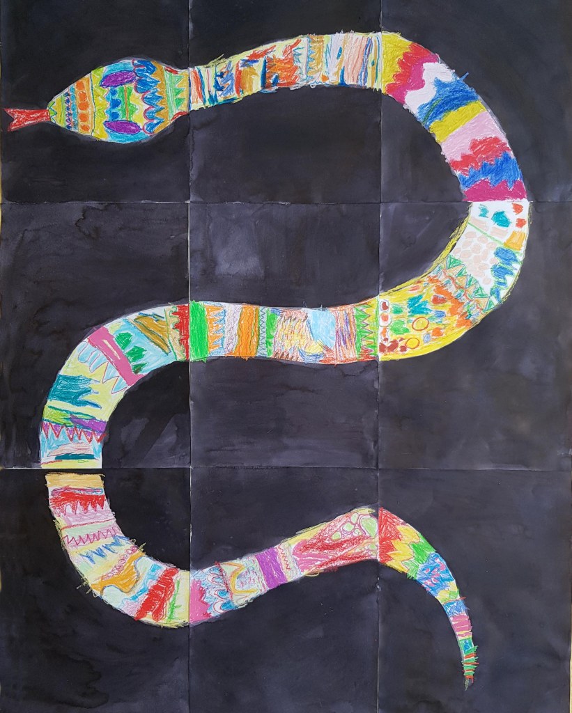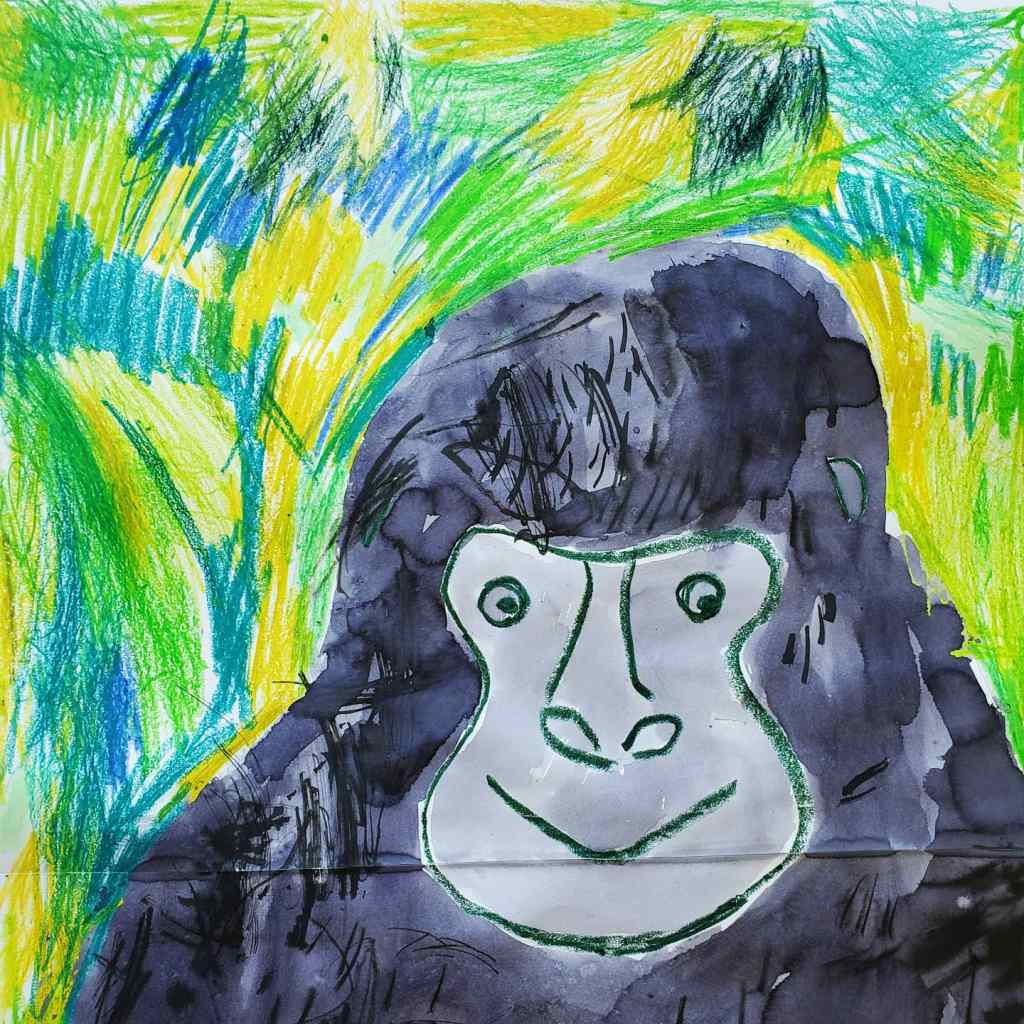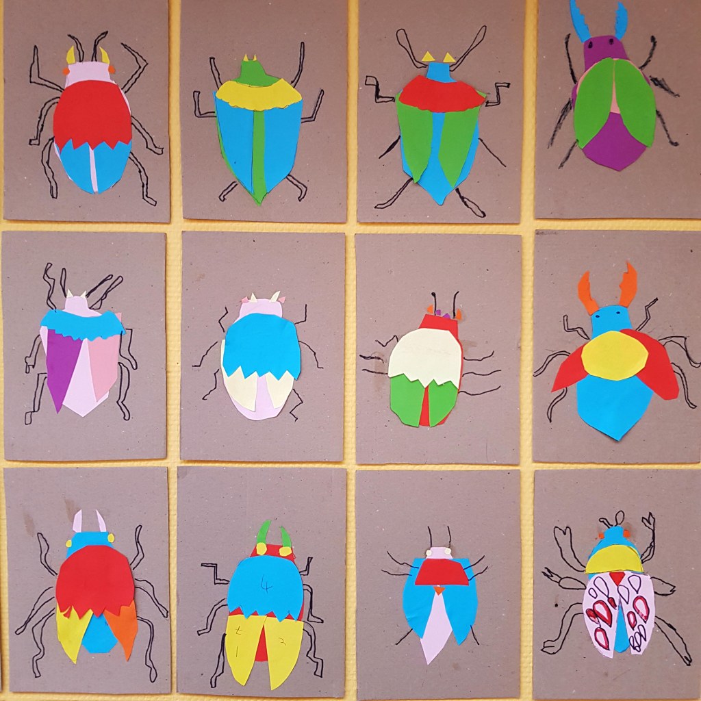 Ateliers sur le thème de la jungle proposés à l’École Élémentaire Dian Fossey à Douvres-la-Délivrandes (14). Pour une partie, les réalisations des 5 classes (TPS-CP) ont servi à imaginer la fresque sous le préau de l’école que nous avons peinte ensemble avec les enfants.