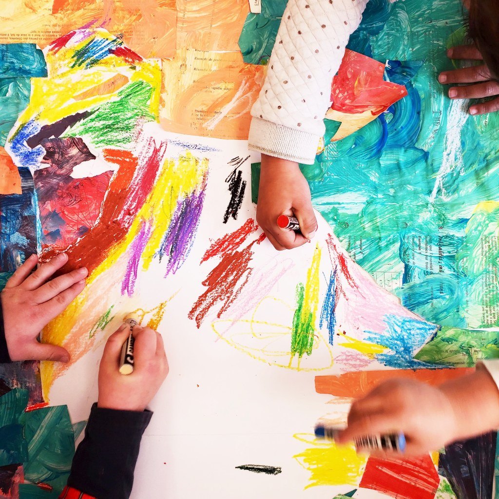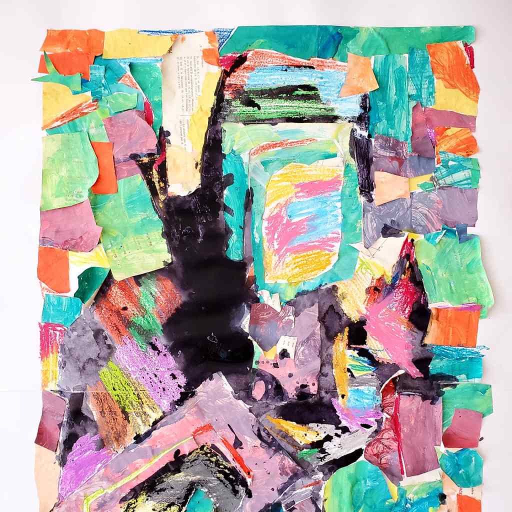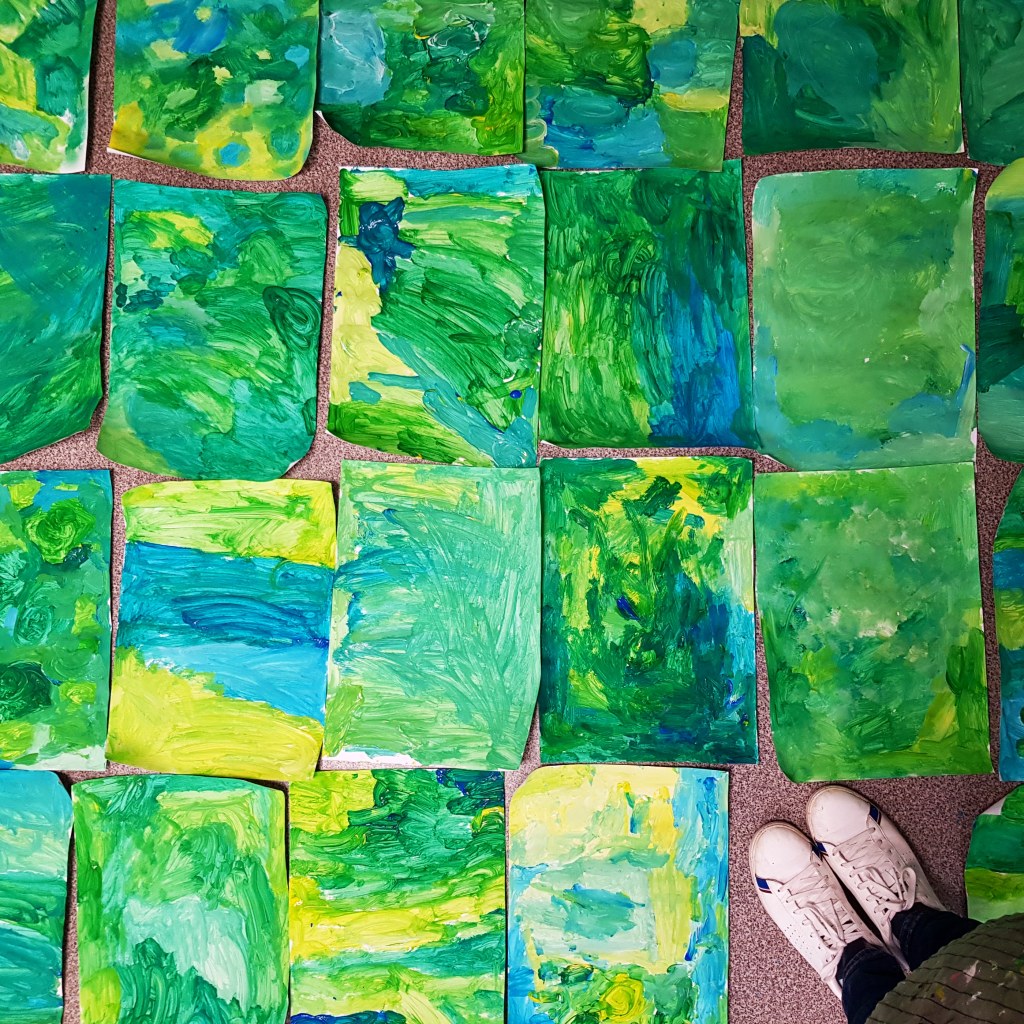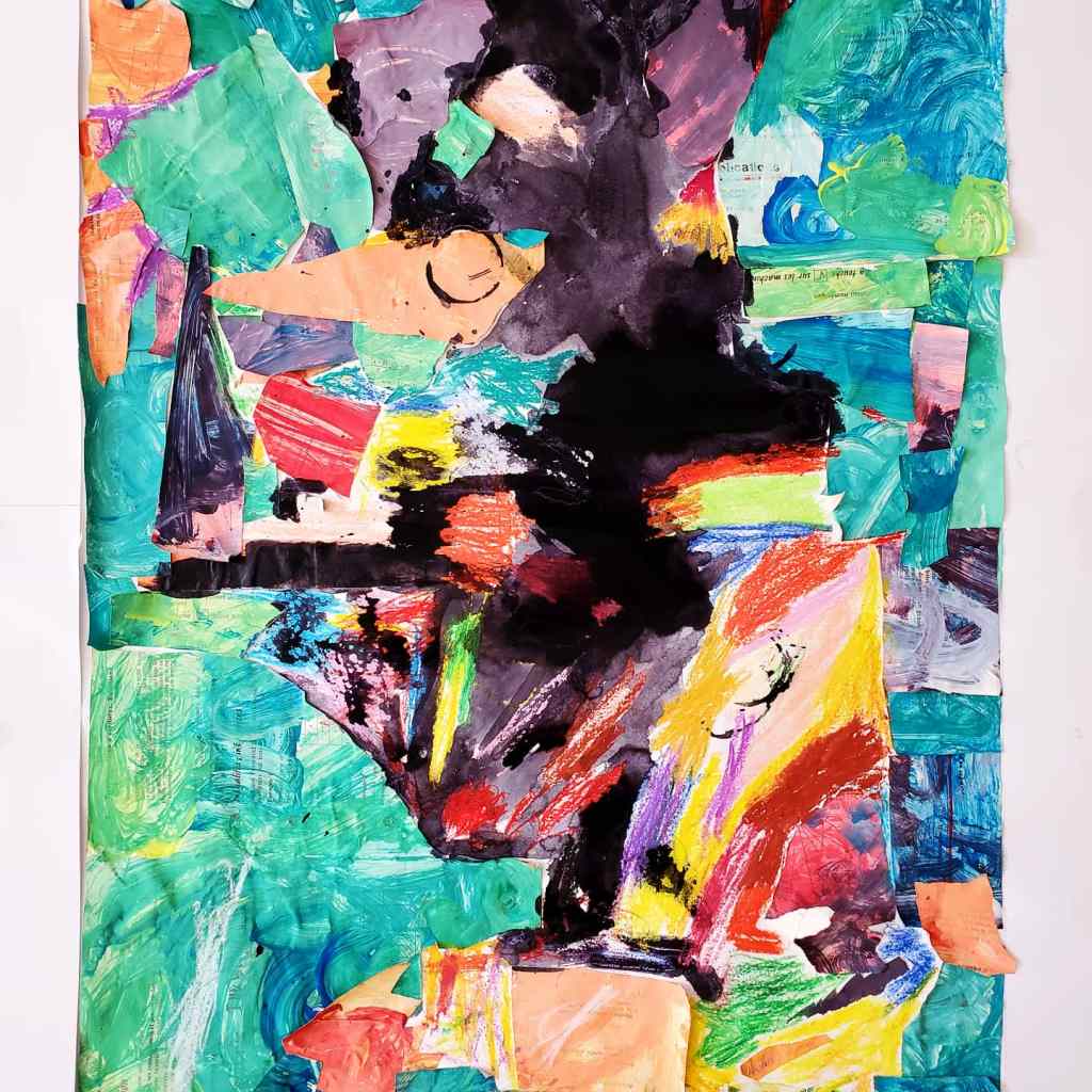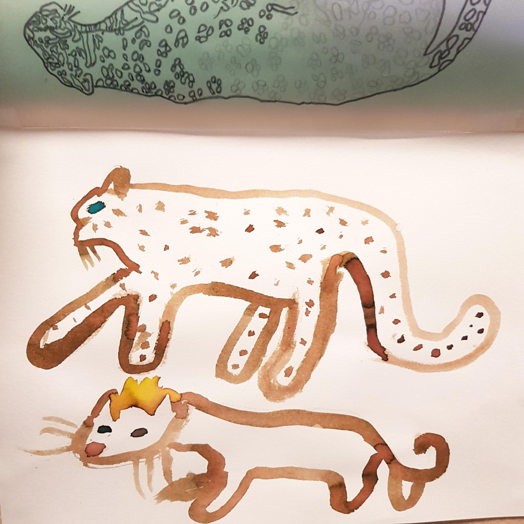 Ateliers sur le thème de la jungle proposés à l’École Élémentaire Dian Fossey à Douvres-la-Délivrandes (14). Pour une partie, les réalisations des 5 classes (TPS-CP) ont servi à imaginer la fresque sous le préau de l’école que nous avons peinte ensemble avec les enfants.