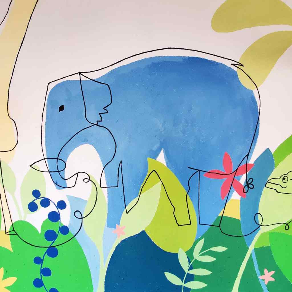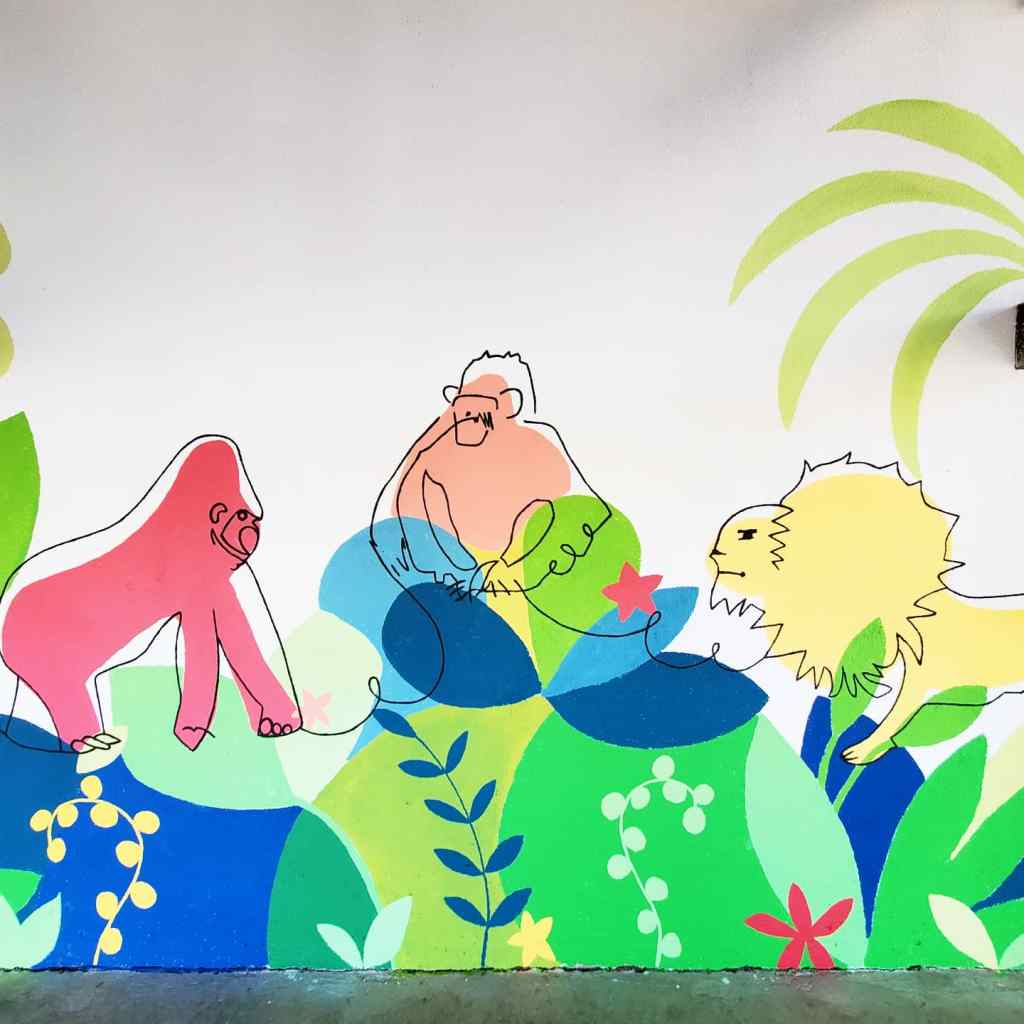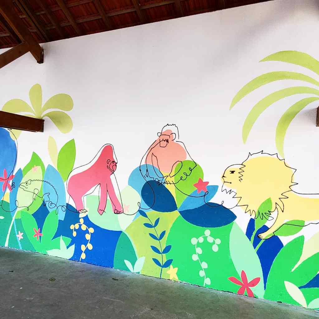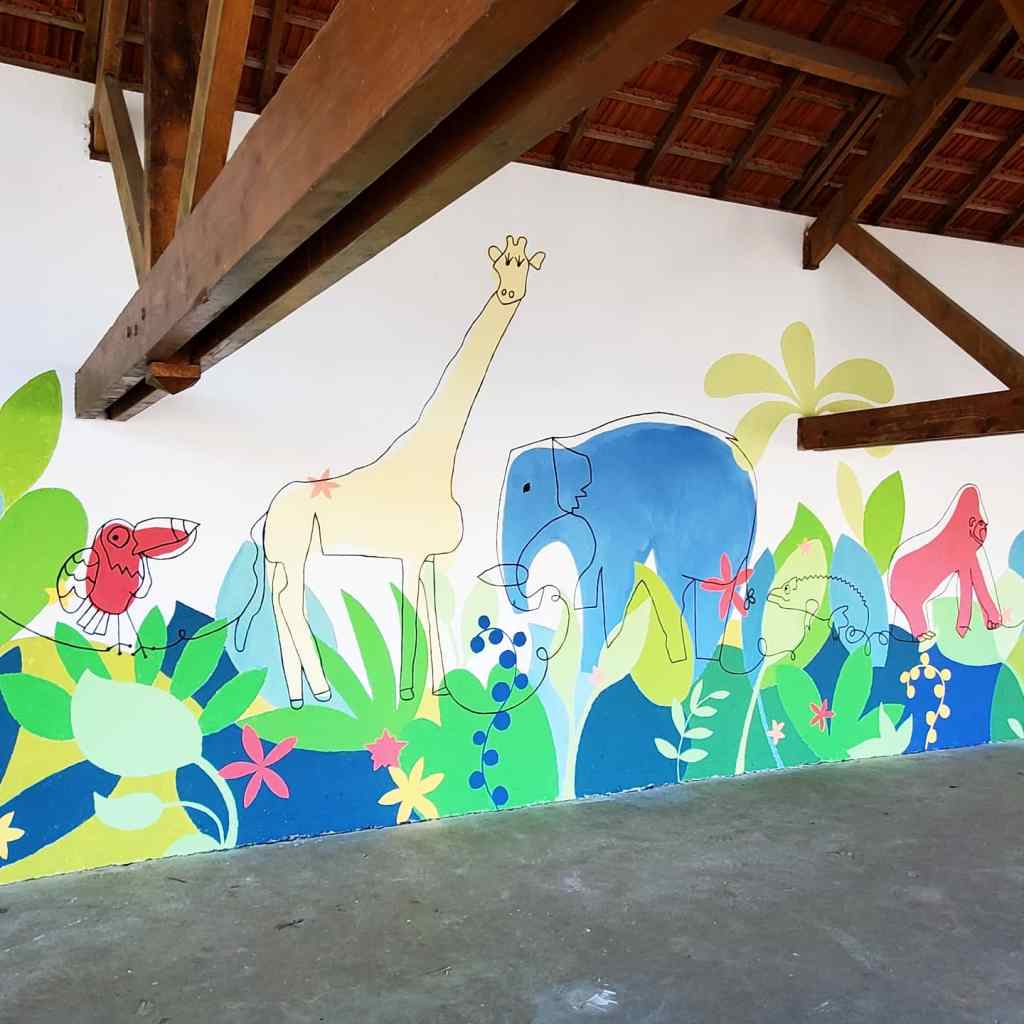 Fresque sur le thème de la jungle réalisée avec les élèves (TPS-CP) de l’École Élémentaire Dian Fossey à Douvres-la-Délivrandes (14). La fresque est basée sur les productions des enfants réalisées pendant les ateliers préparatoires à voir ici.
