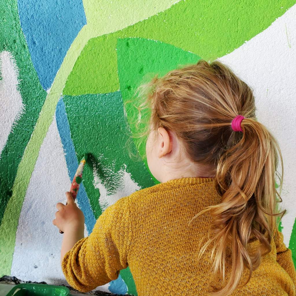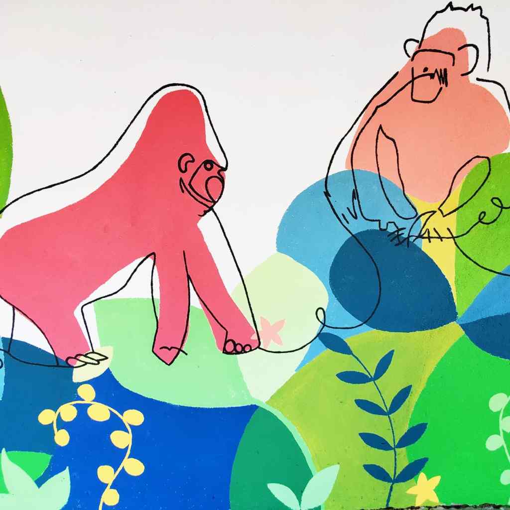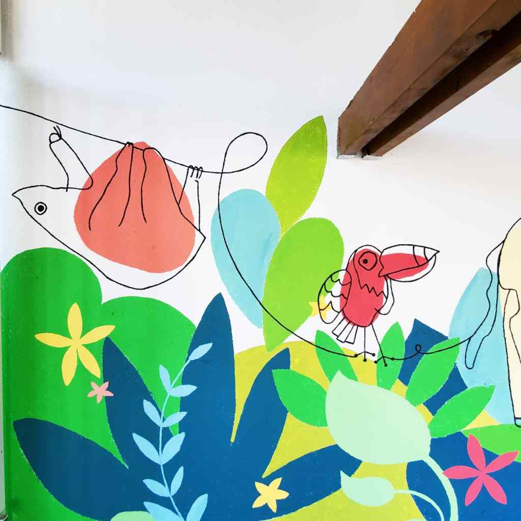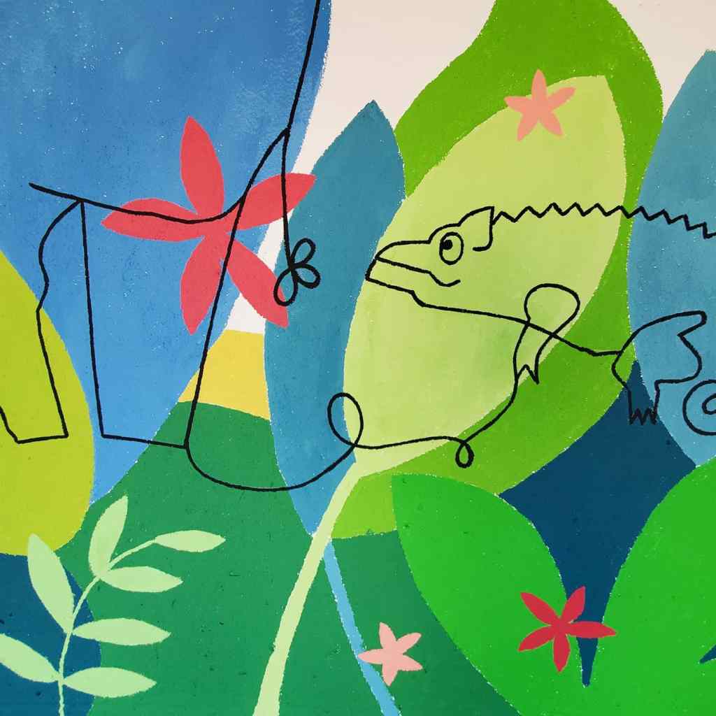 Fresque sur le thème de la jungle réalisée avec les élèves (TPS-CP) de l’École Élémentaire Dian Fossey à Douvres-la-Délivrandes (14). La fresque est basée sur les productions des enfants réalisées pendant les ateliers préparatoires à voir ici.