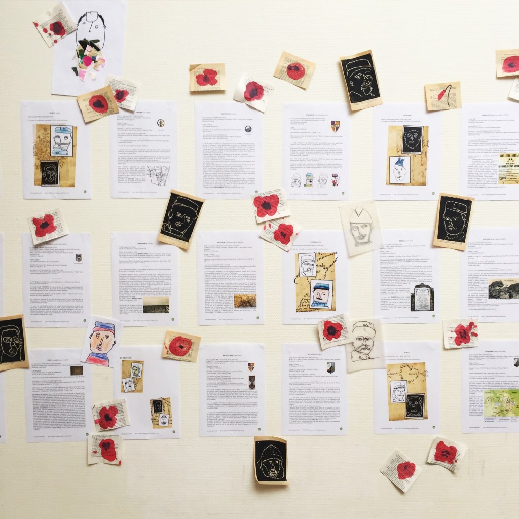 Ensemble avec les élèves de l’École Élémentaire Hector Malot nous avons créé des illustrations de soldats de la Première Guerre mondiale. Ces images ont illustré le « Livret des Poilus » – un travail de recherche et de rédaction effectué par le Conseil des Sages. Nos portraits imaginaires (accompagnés de coquelicots réalisés à l’encre rouge) ont ensuite fait partie d’une grande l’exposition sur le thème de la Première Guerre mondiale organisée par la commune.