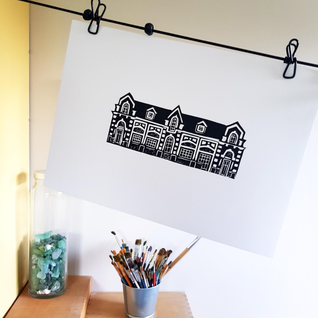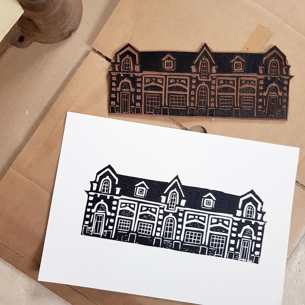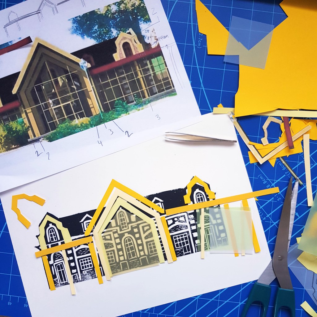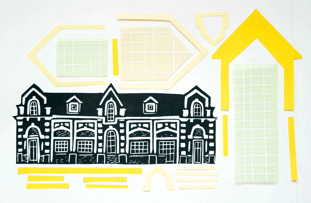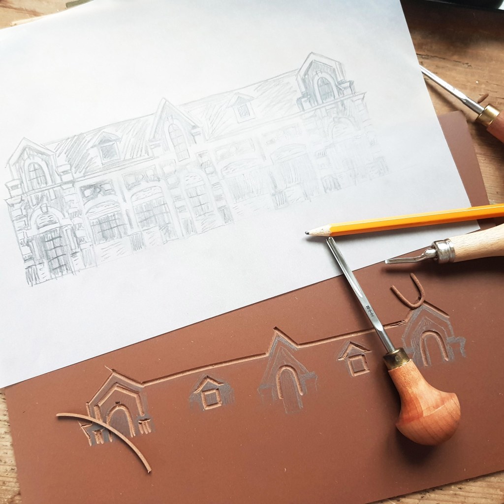 Médiathèque Galerie, médiation Transformation graphique des « anciennes écuries » de Grand Bourgtheroulde en médiathèque Linogravure et découpage papier Similaire