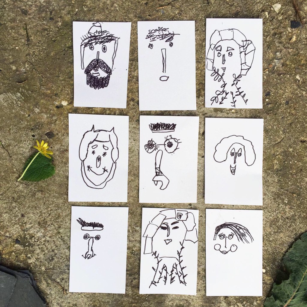 C’était trop court? Allez plus loin! Sur de petits morceaux de papier (nous avons découpé une feuille A4 en 8 petites cartes) essayez de dessiner rapidement les visages que vous avez créés. Le feutre est un outil intéressant pour ce genre d’exercice – il vous oblige à simplifier vos traits.