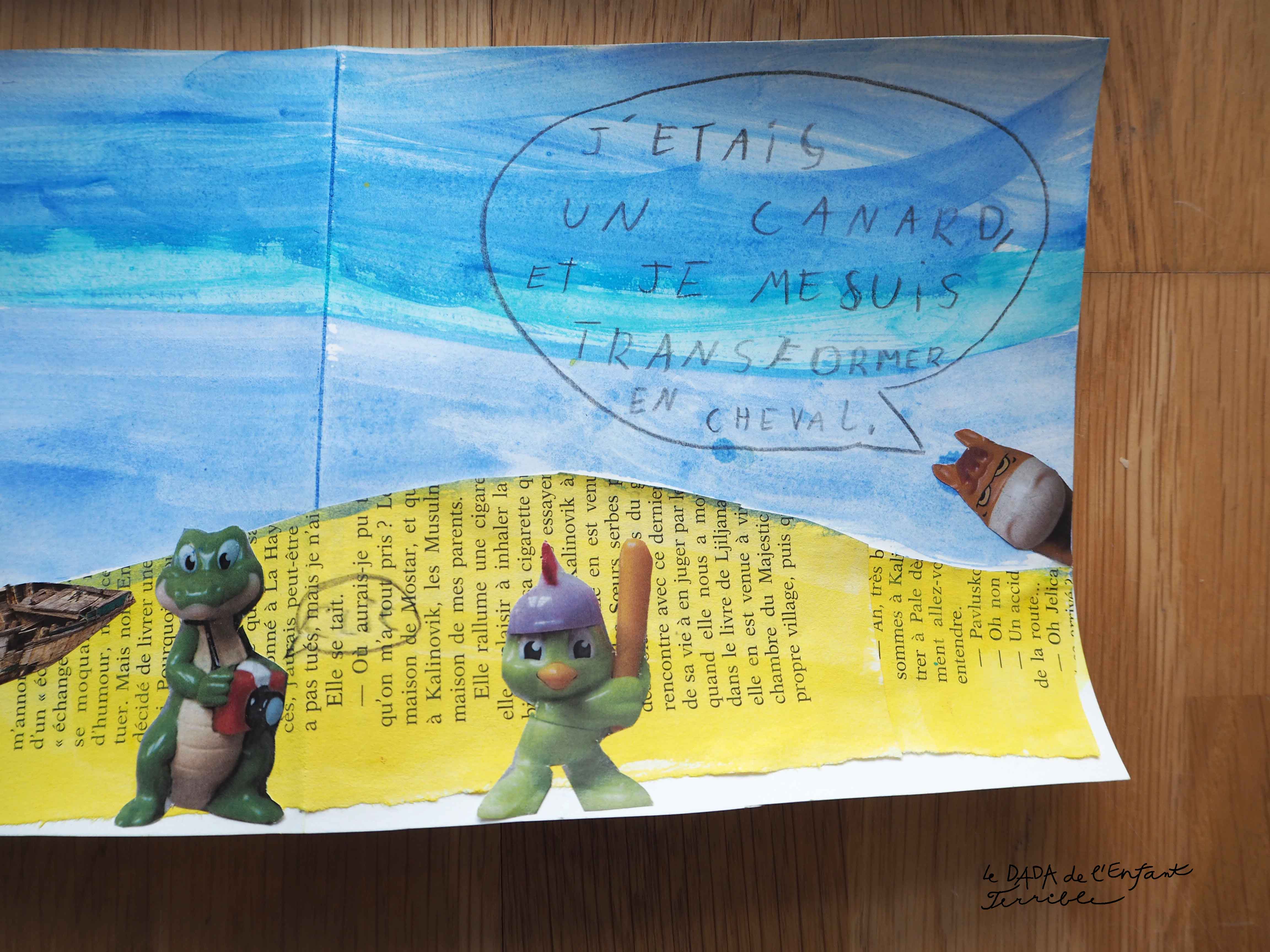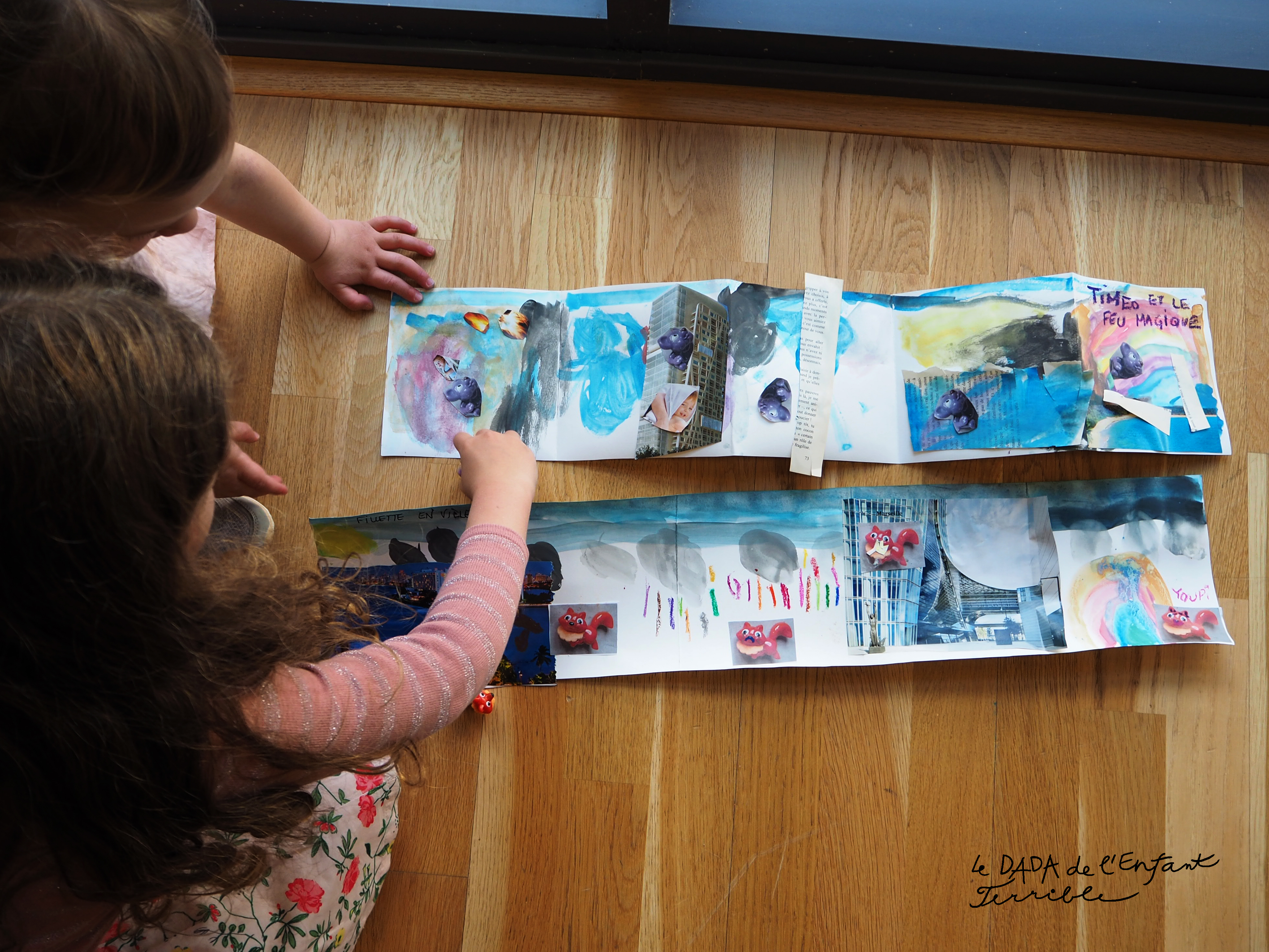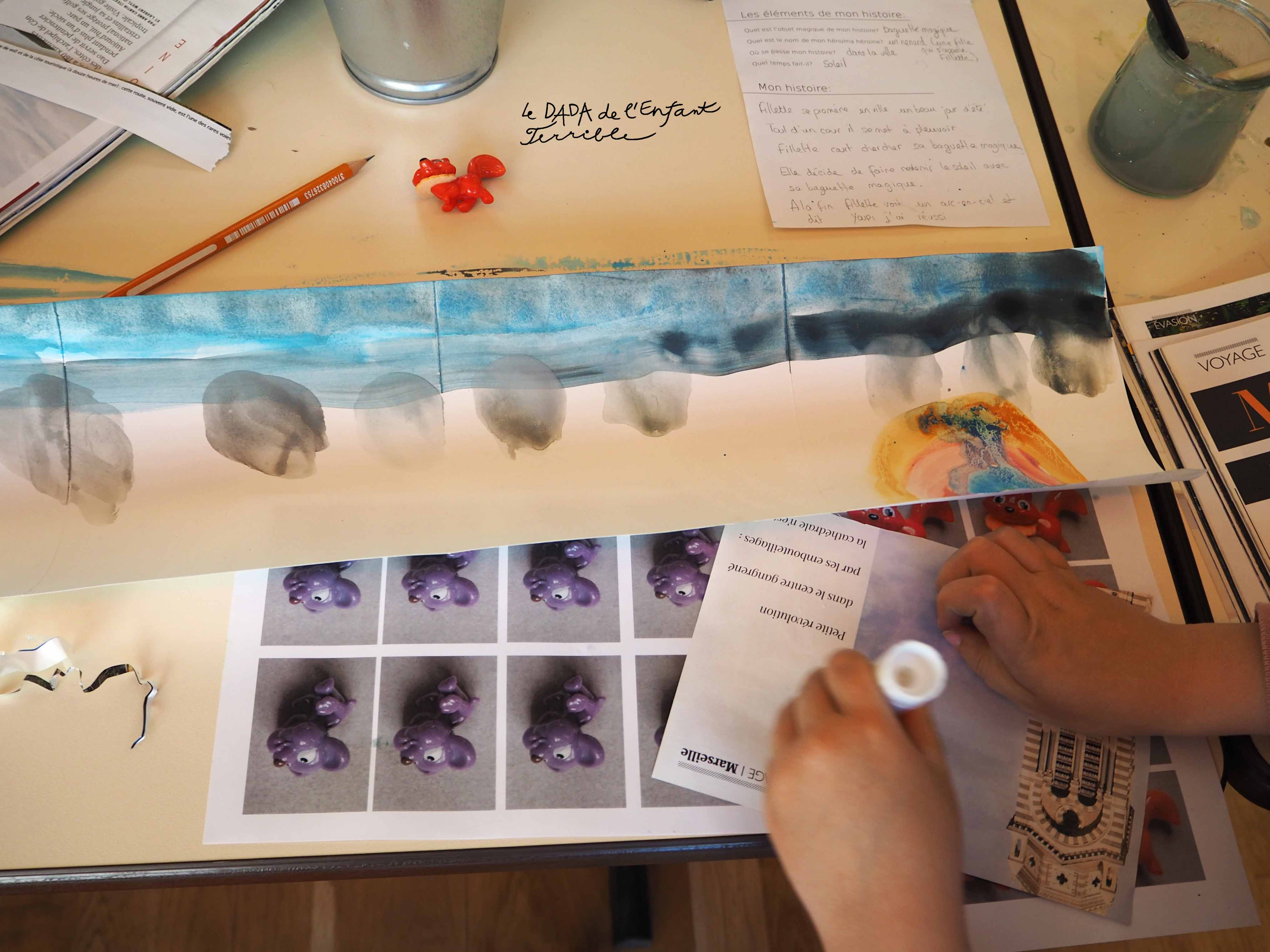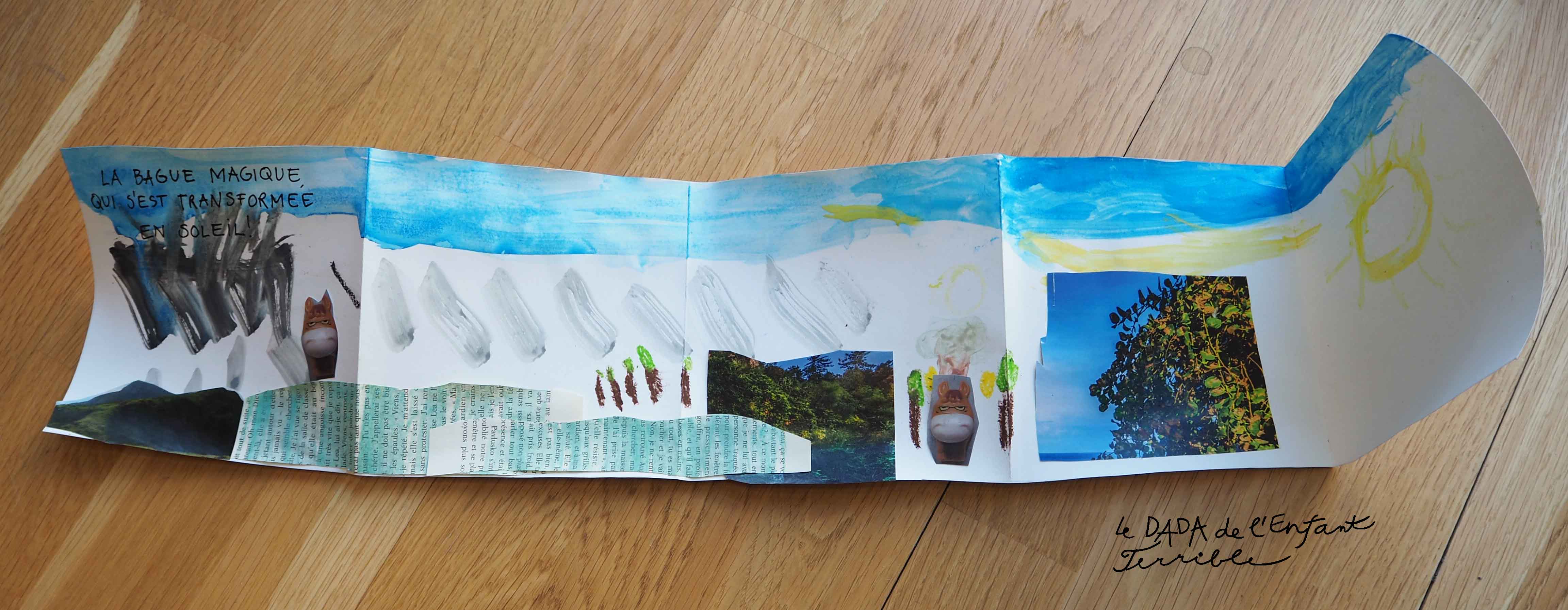 Création des livres par les enfants accompagnés ou non par leurs parents. Atelier de 2 heures: construction d’histoires à partir de personnages récupérés auprès de lecteurs de la médiathèque. Pour la fabrication des livres nous avons réutilisé de vieux magazines et livres de la médiathèque. Les personnages principaux et d’autres éléments des histoires ont été tirés au sort. Chaque enfant a pu imaginer une histoire et fabriquer son propre livre.