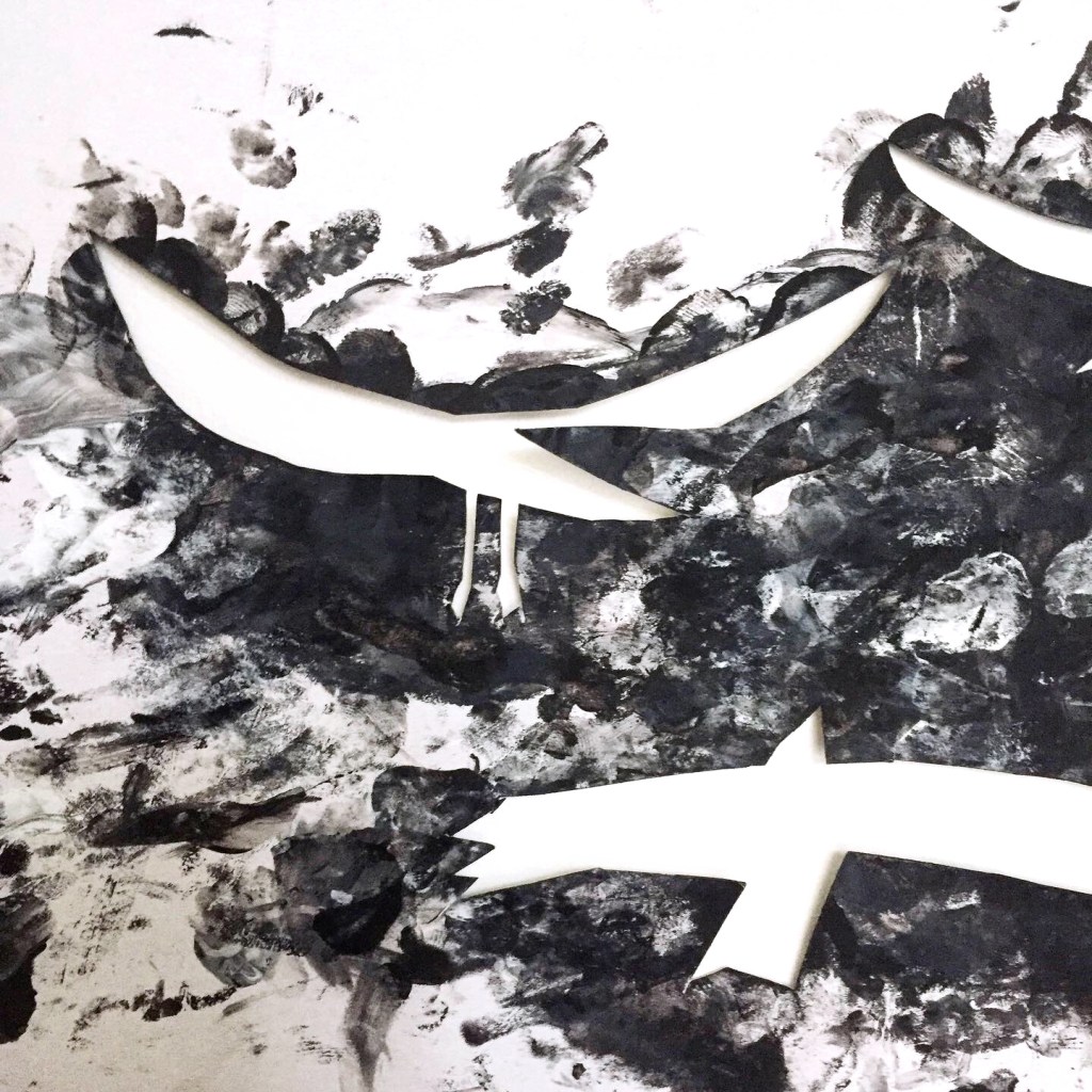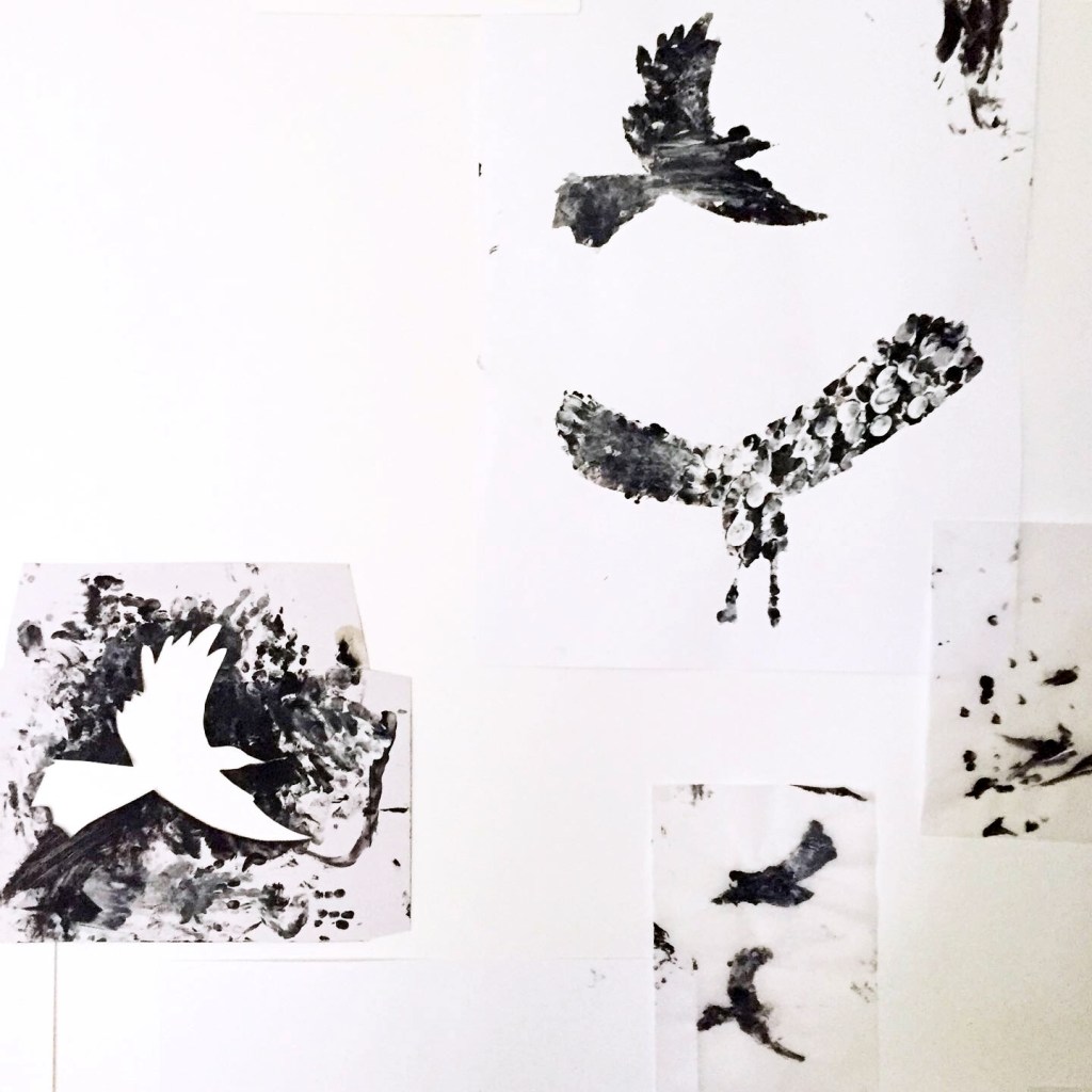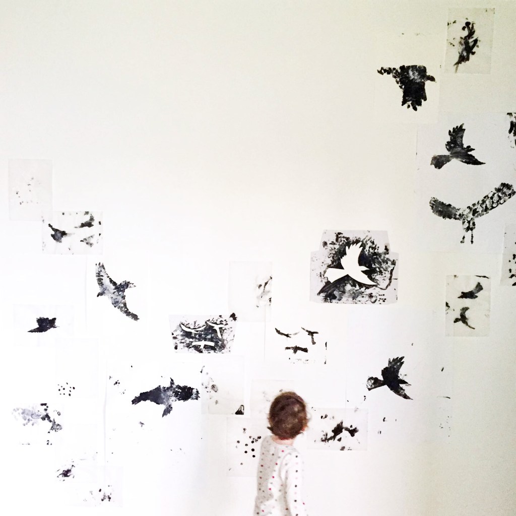 Quelques pochoirs, de la peinture noire et blanche, des doigts et des mains, des feuilles, du papier calque aussi… une fresque réalisée avec les enfants d’une des crèches Liberty.