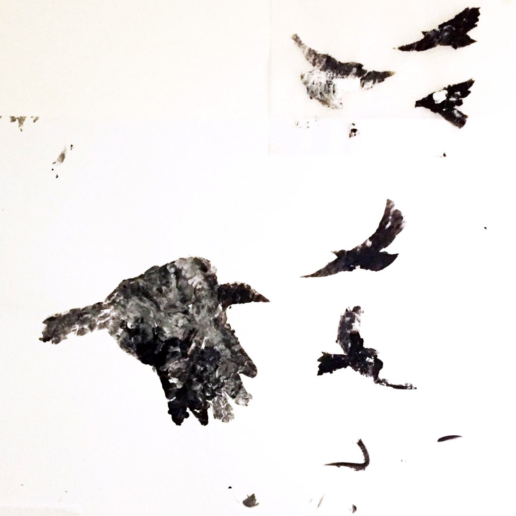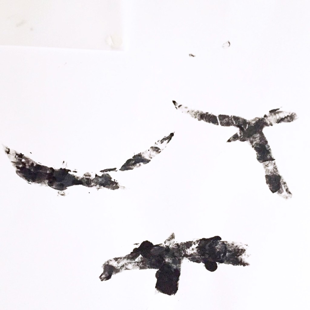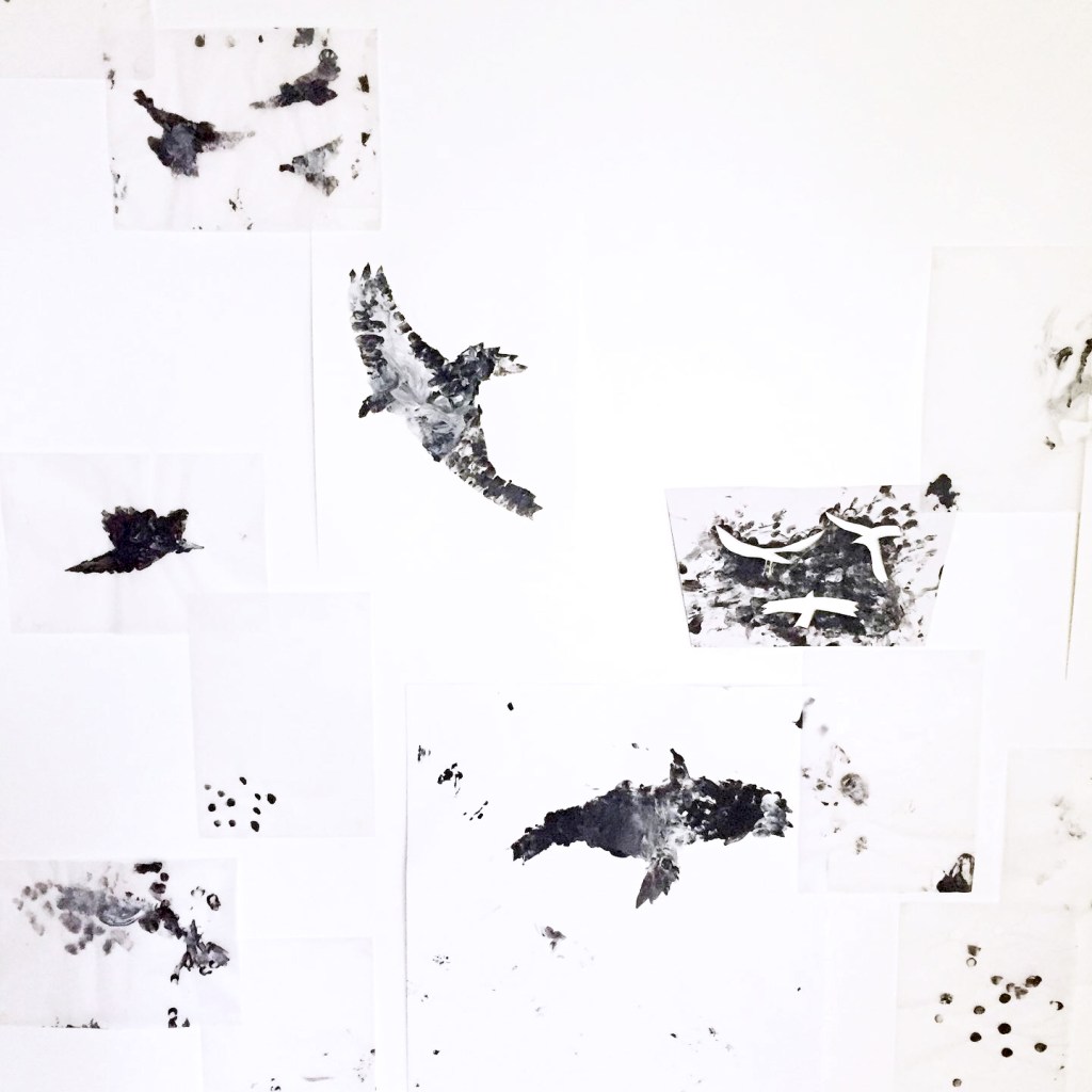 Quelques pochoirs, de la peinture noire et blanche, des doigts et des mains, des feuilles, du papier calque aussi… une fresque réalisée avec les enfants d’une des crèches Liberty.