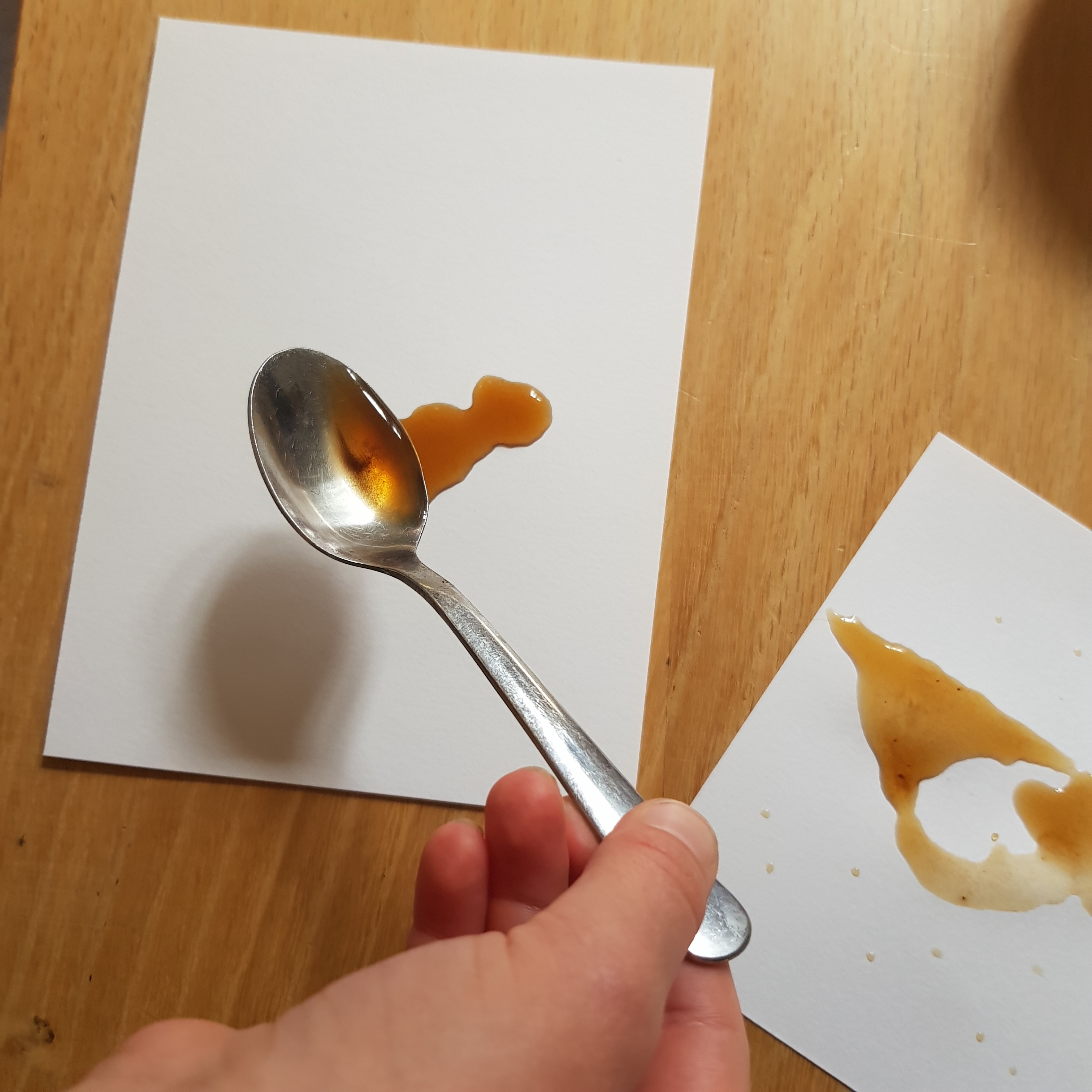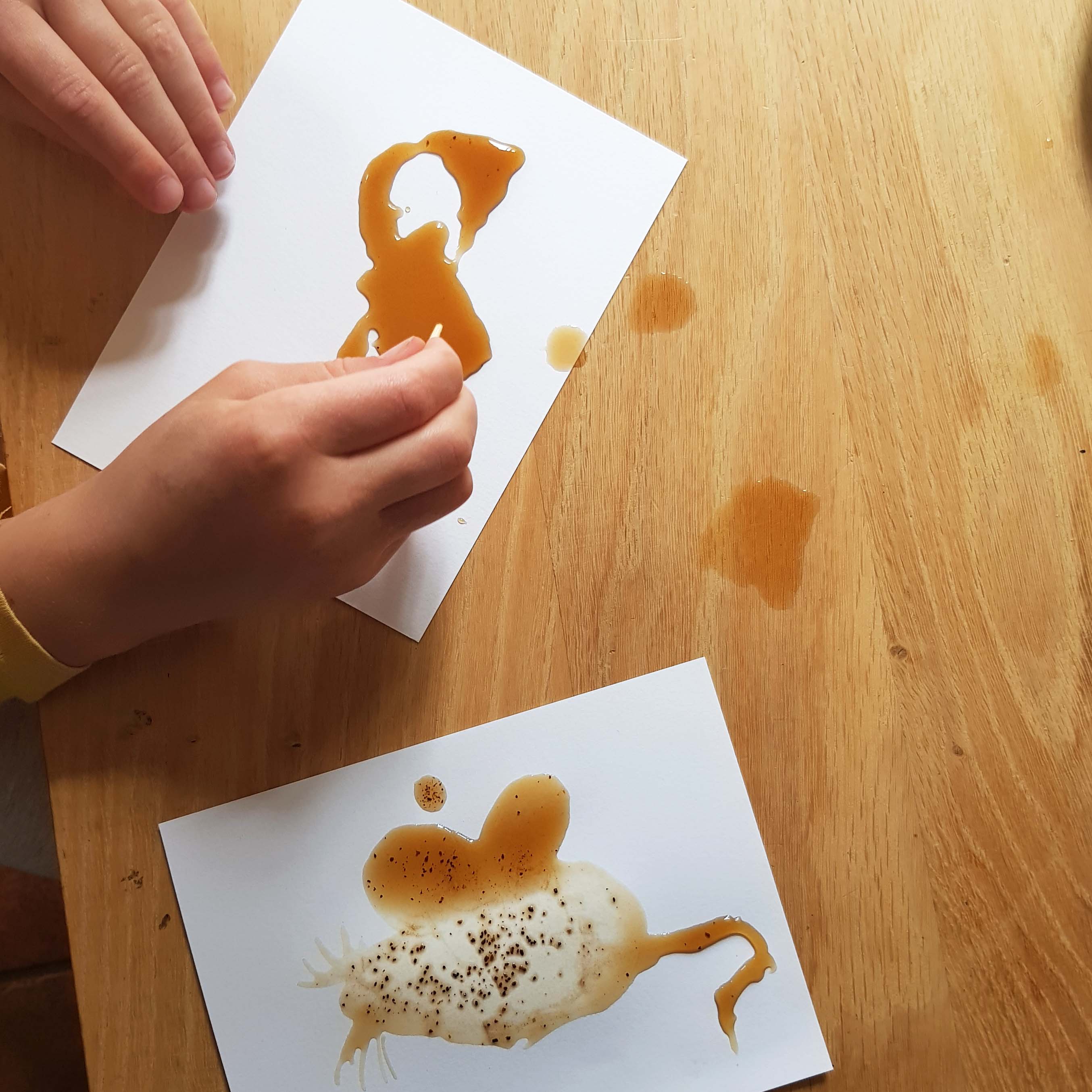 Et puis maintenant c’est très simple: faites des taches, transformez-les en monstres à l’aide de la cuillère ou du pique en bois… ou alors dessinez complètement autre chose mais amusez-vous!