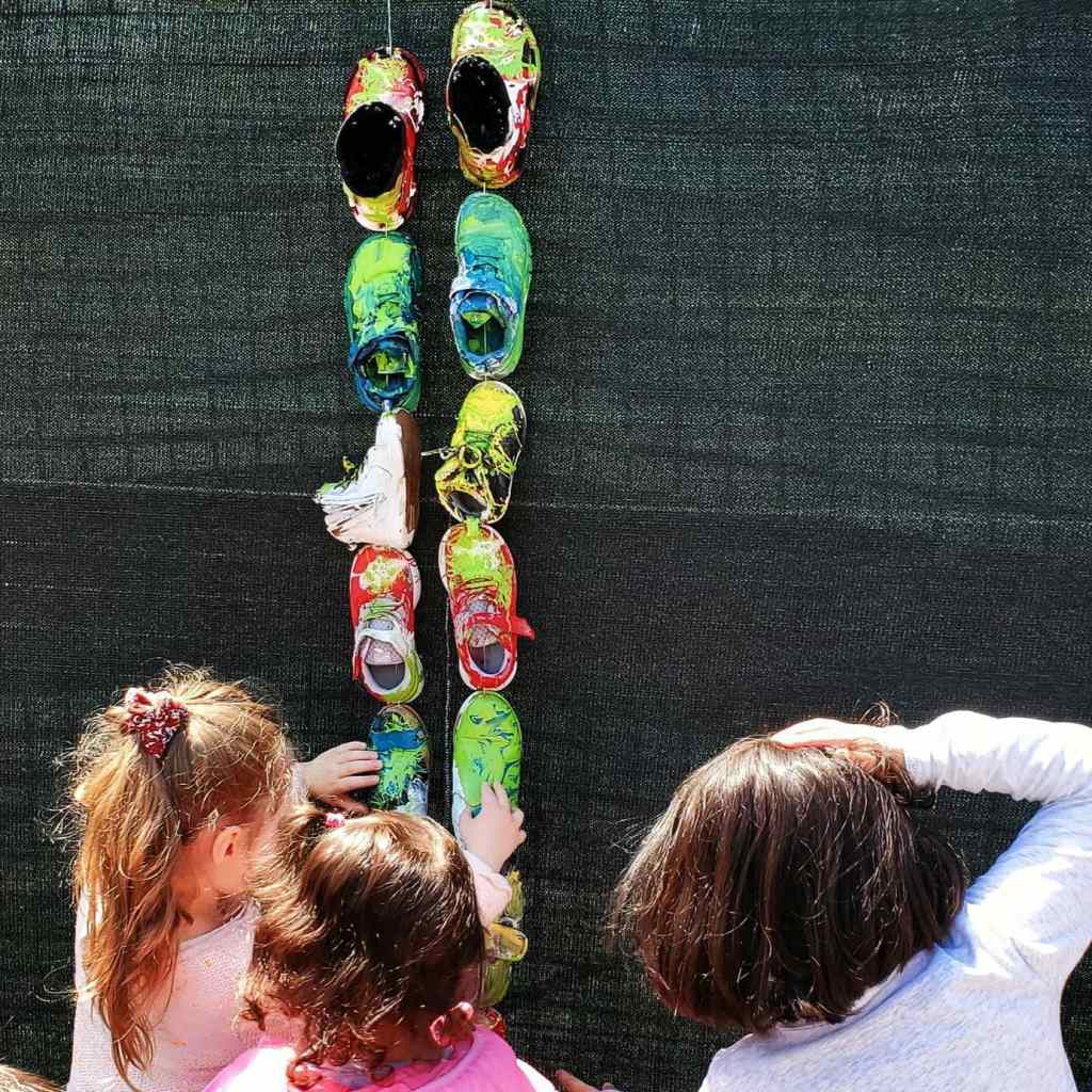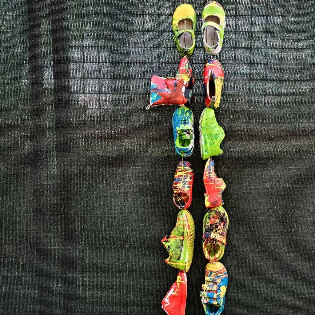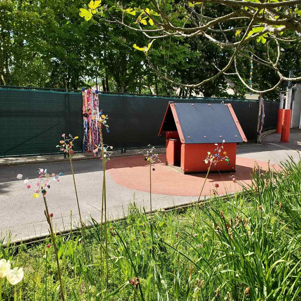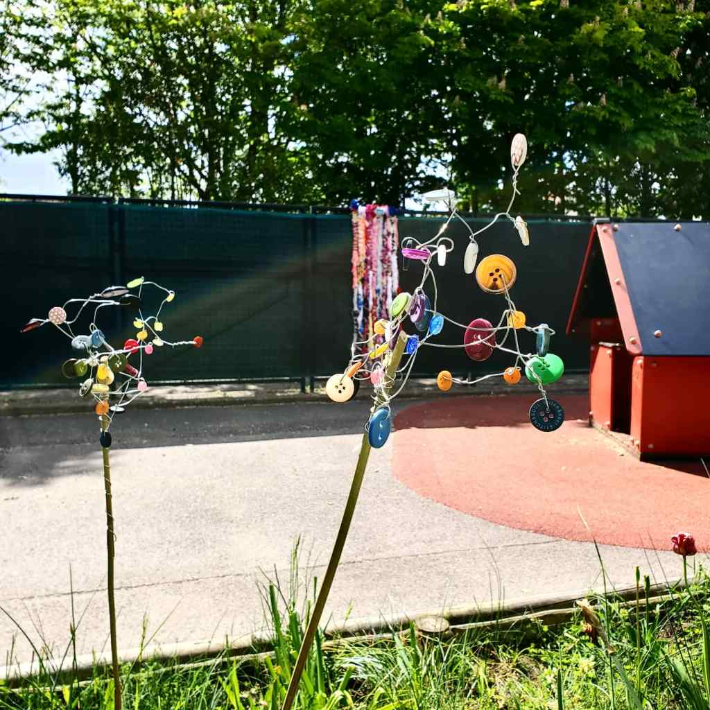 Créer avec les enfants à partir des objets que nous avons récupérés auprès des parents pour décorer leur cour de récréation. Un projet d’école original, un accueil chaleureux – de beaux souvenirs de la semaine passée à l’école maternelle de Bussy-Saint-Georges (77)