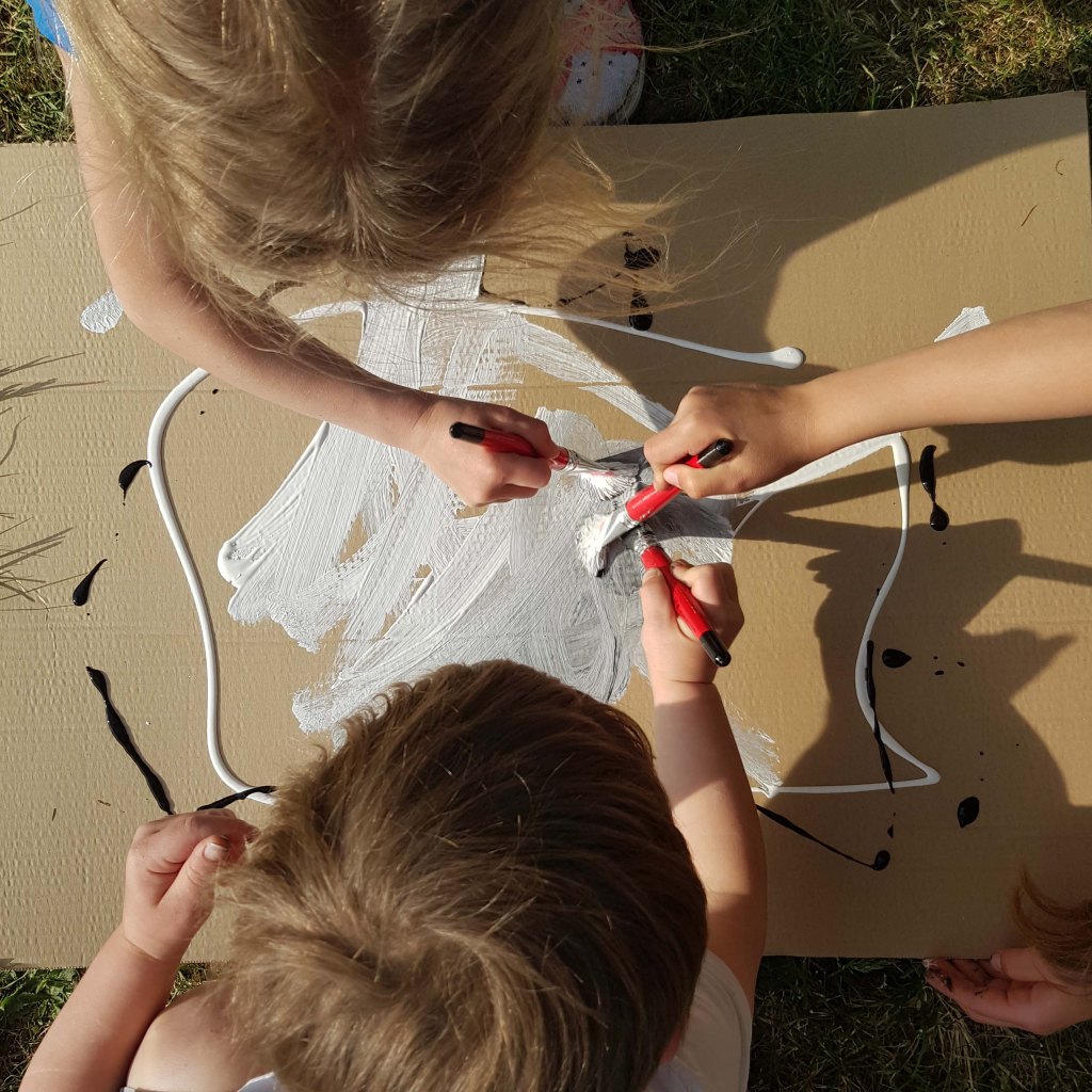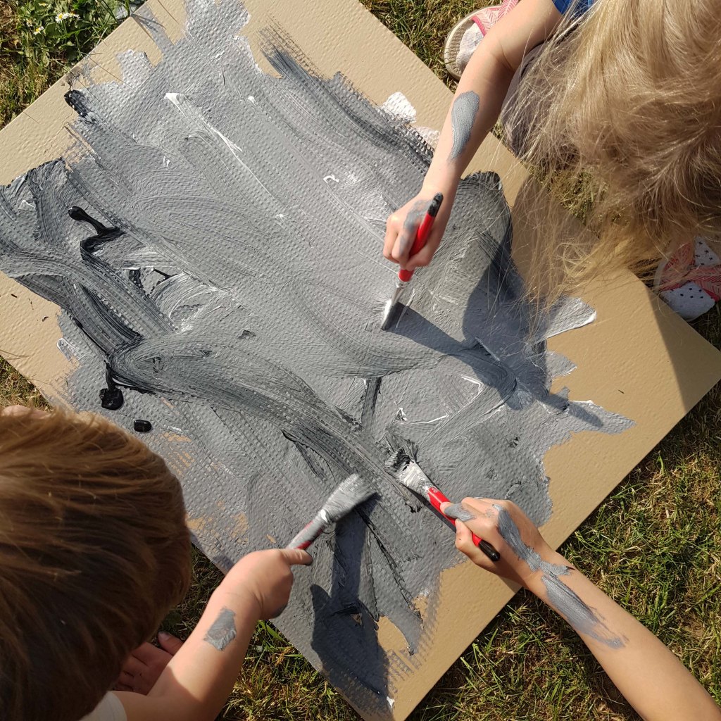 Disons le franchement, rien que de faire de la peinture libre sur un gros carton, est un pur bonheur! Si vous en avez la possibilité, laissez à votre artiste la possibilité de faire de la peinture avec ses mains et ses pieds – c’est vraiment fascinant pour les petits. (Seulement il faut surveiller que votre séance de peinture ne se transforme pas en séance de dégustation).