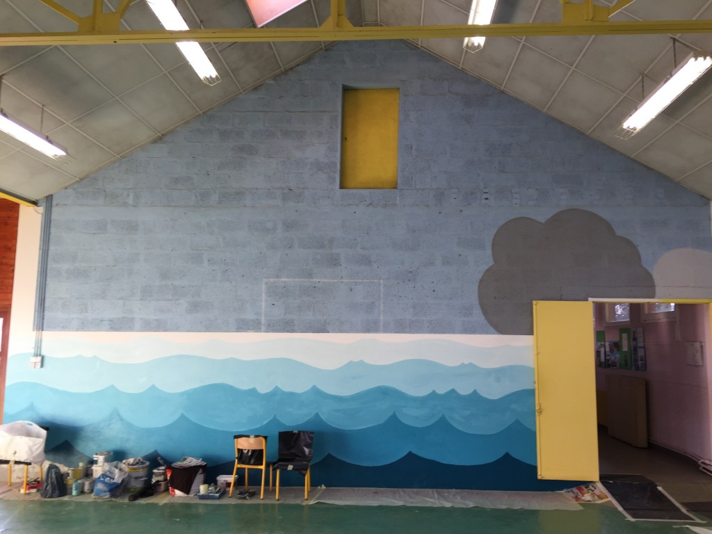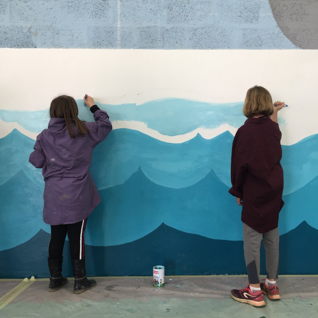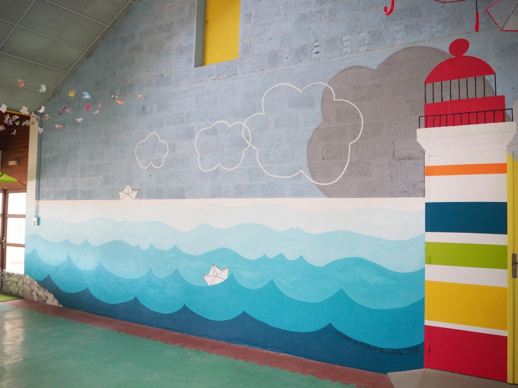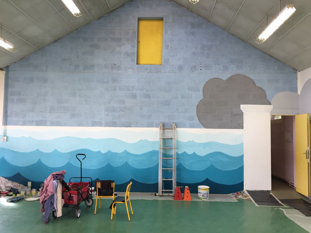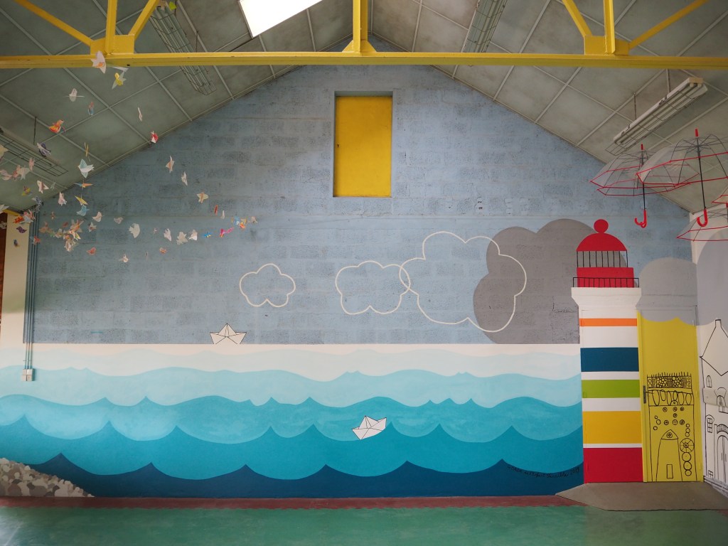 Une grande fresque toute en vagues qui montent avec les différentes tailles des enfants. Chaque élève de l’école a réalisé un oiseau en papier. Ensuite nous avons réuni tous les oiseaux pour les accrocher dans le paysage.