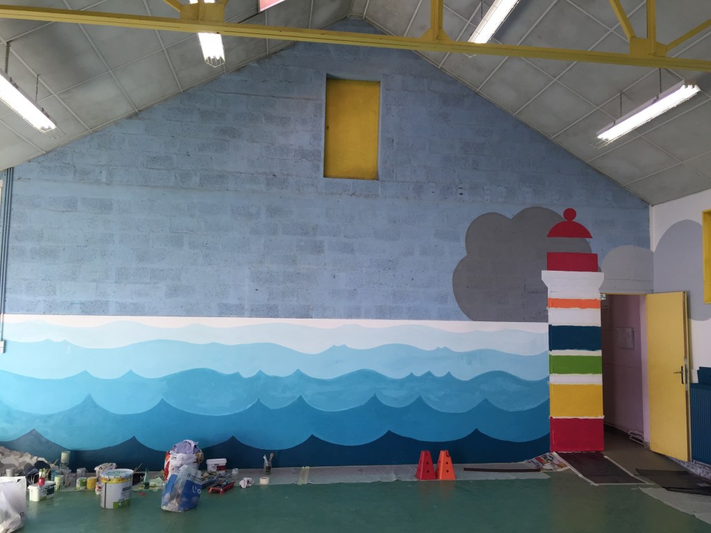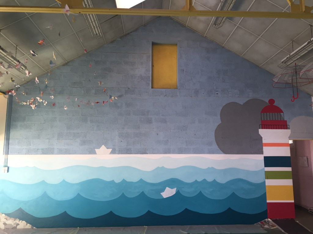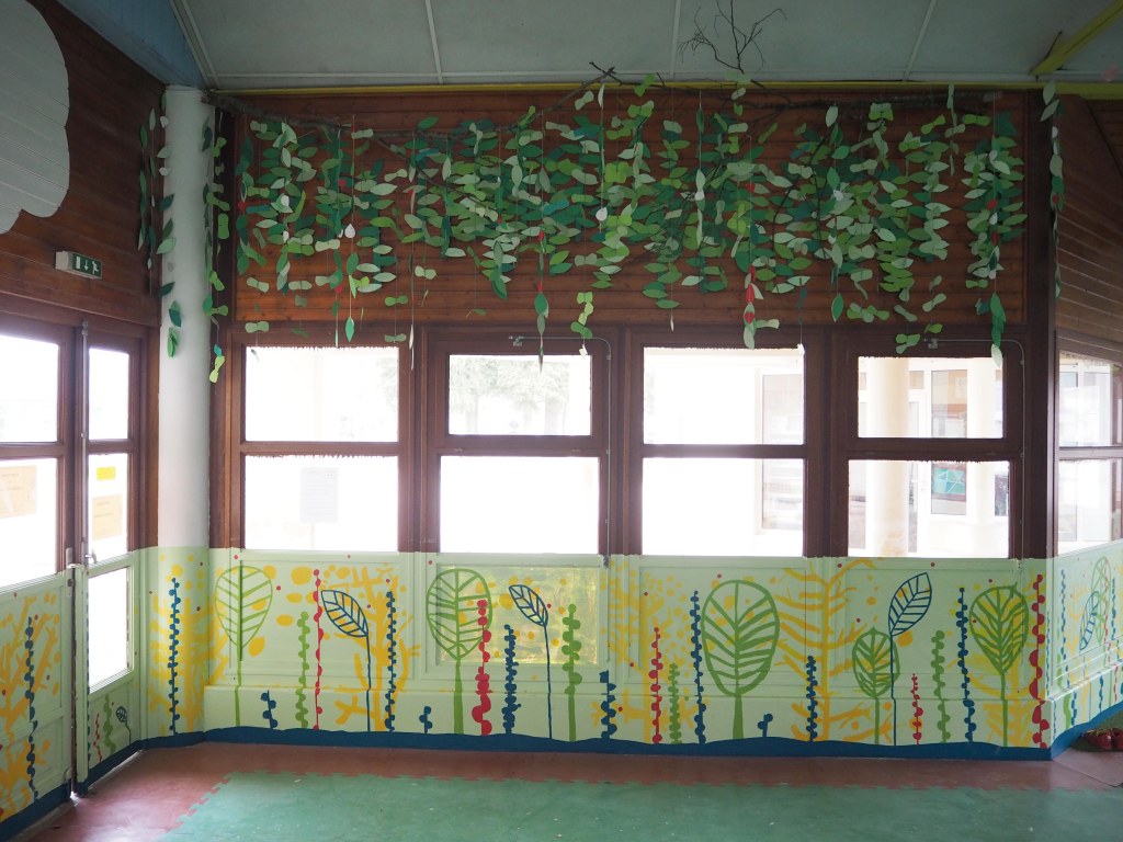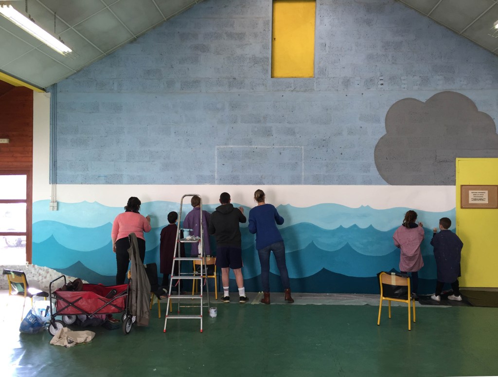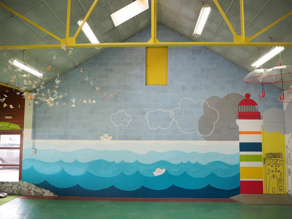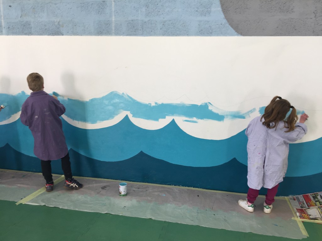 Une grande fresque toute en vagues qui montent avec les différentes tailles des enfants. Chaque élève de l’école a réalisé un oiseau en papier. Ensuite nous avons réuni tous les oiseaux pour les accrocher dans le paysage.