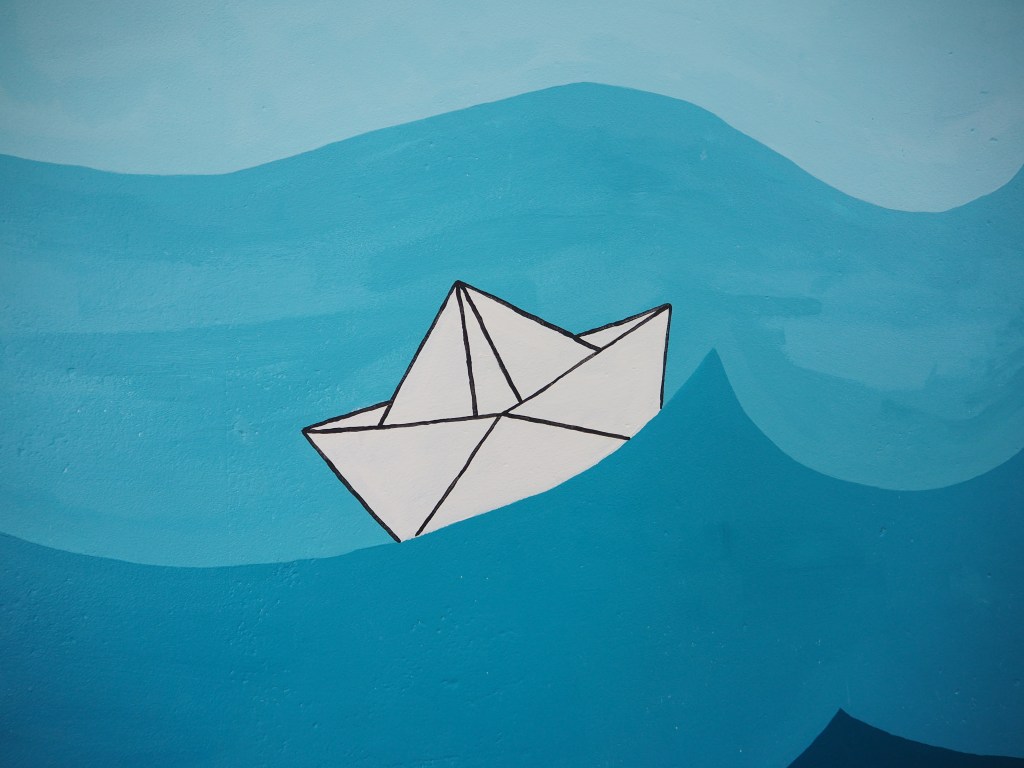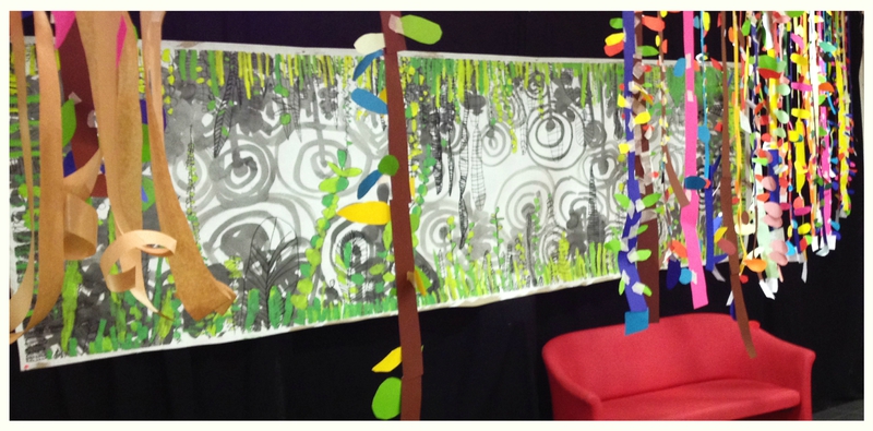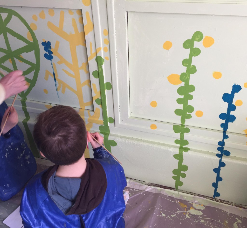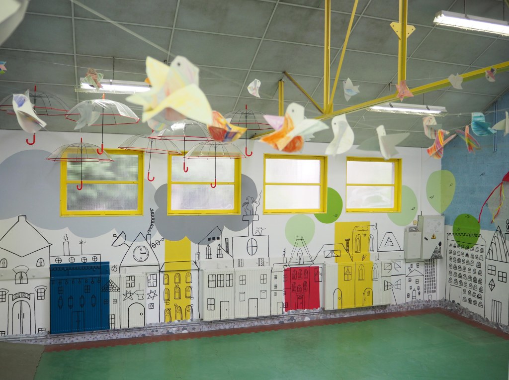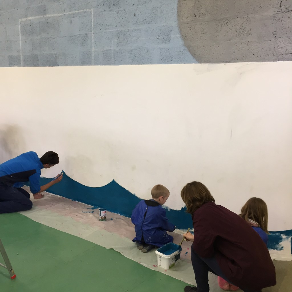 Une grande fresque toute en vagues qui montent avec les différentes tailles des enfants. Chaque élève de l’école a réalisé un oiseau en papier. Ensuite nous avons réuni tous les oiseaux pour les accrocher dans le paysage.