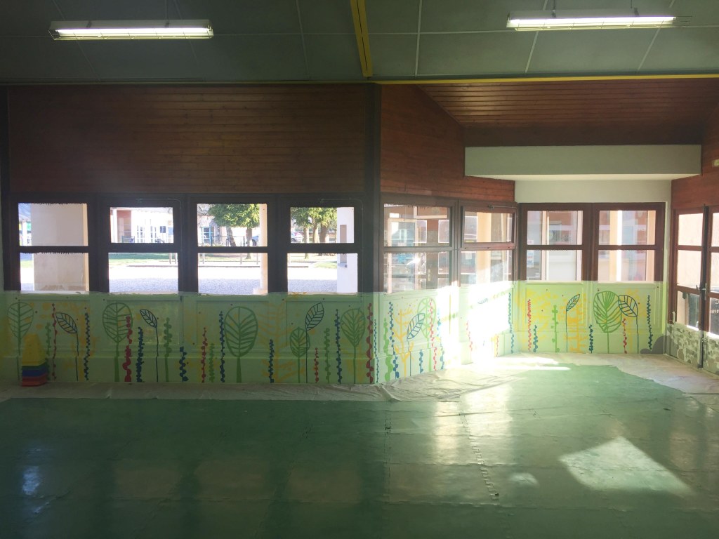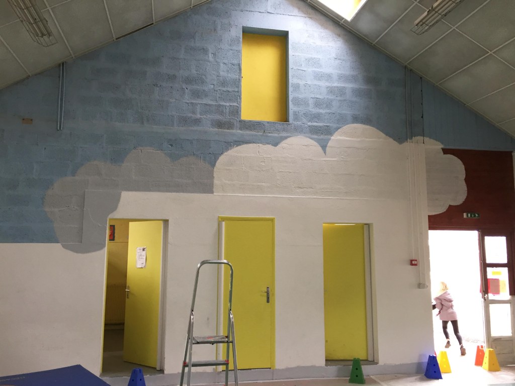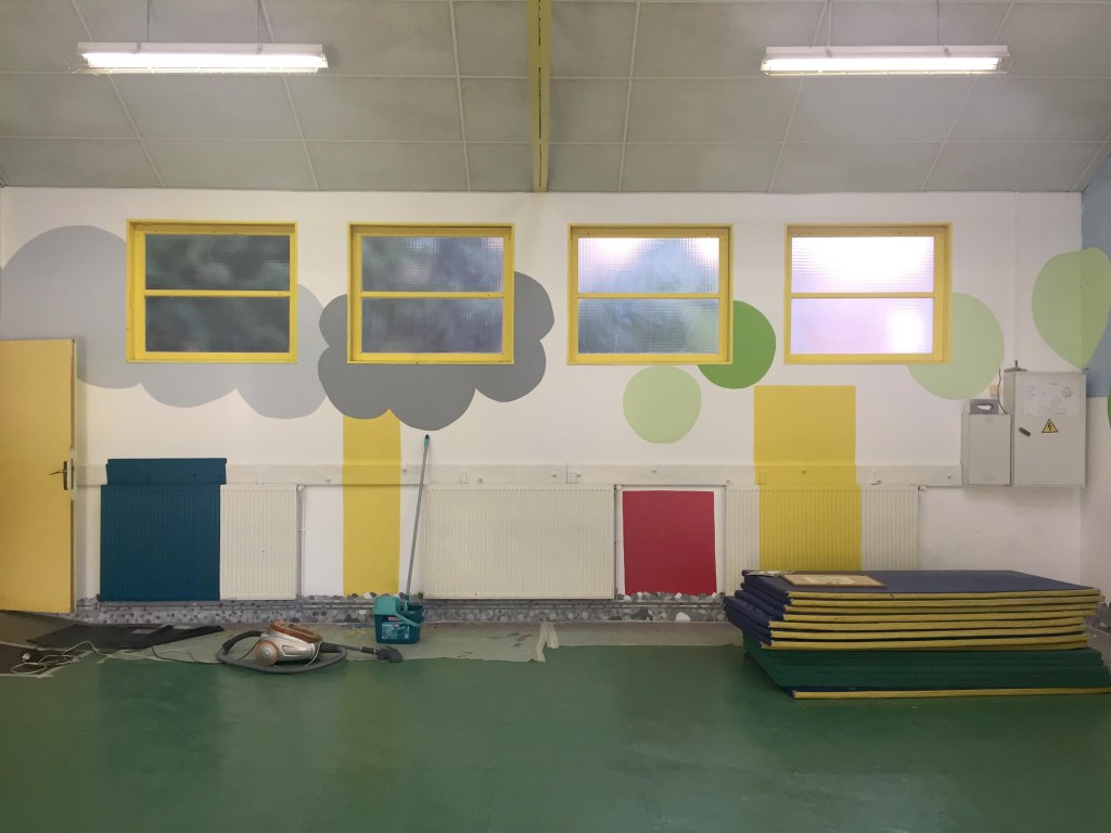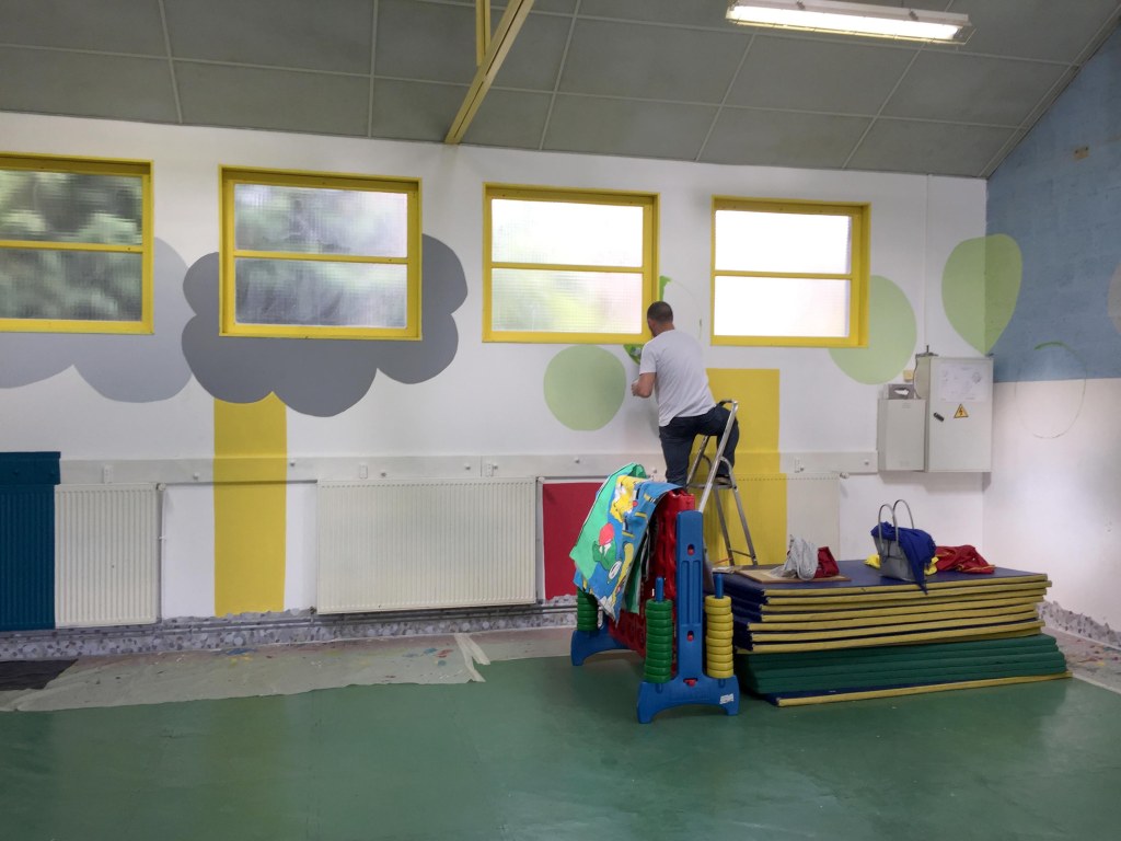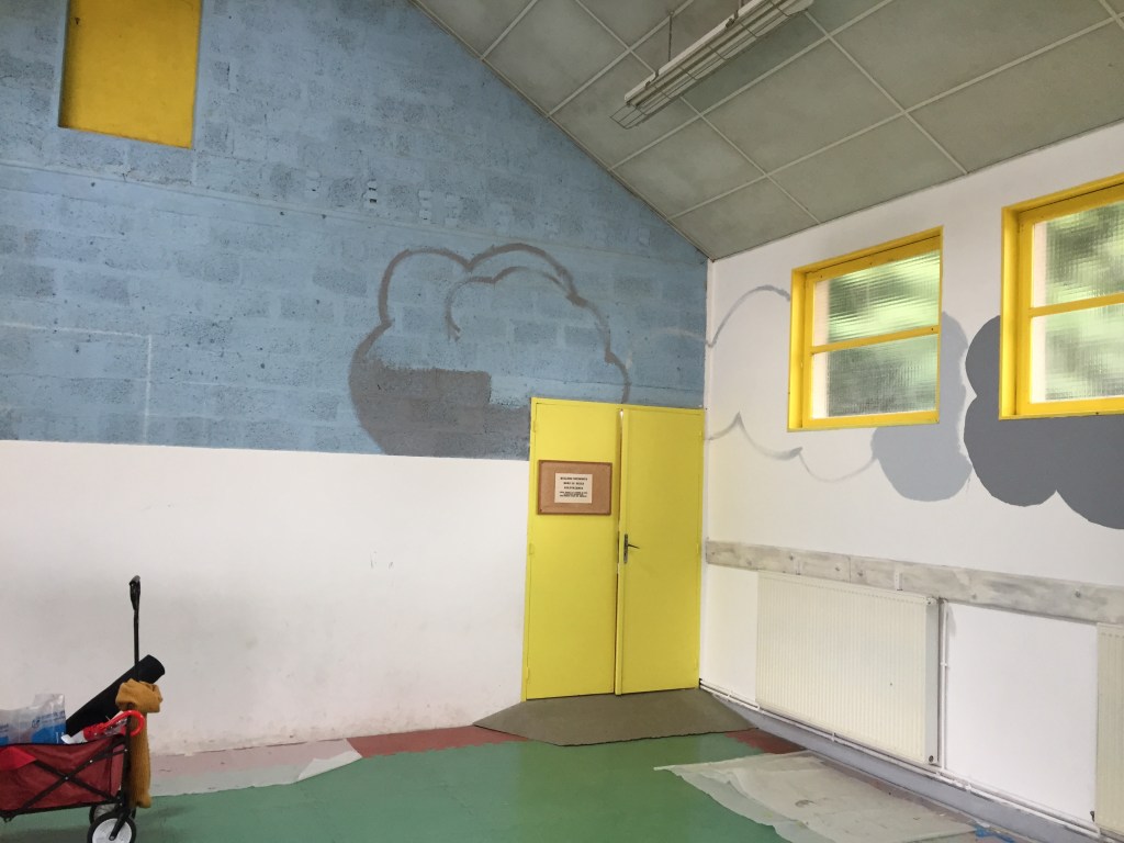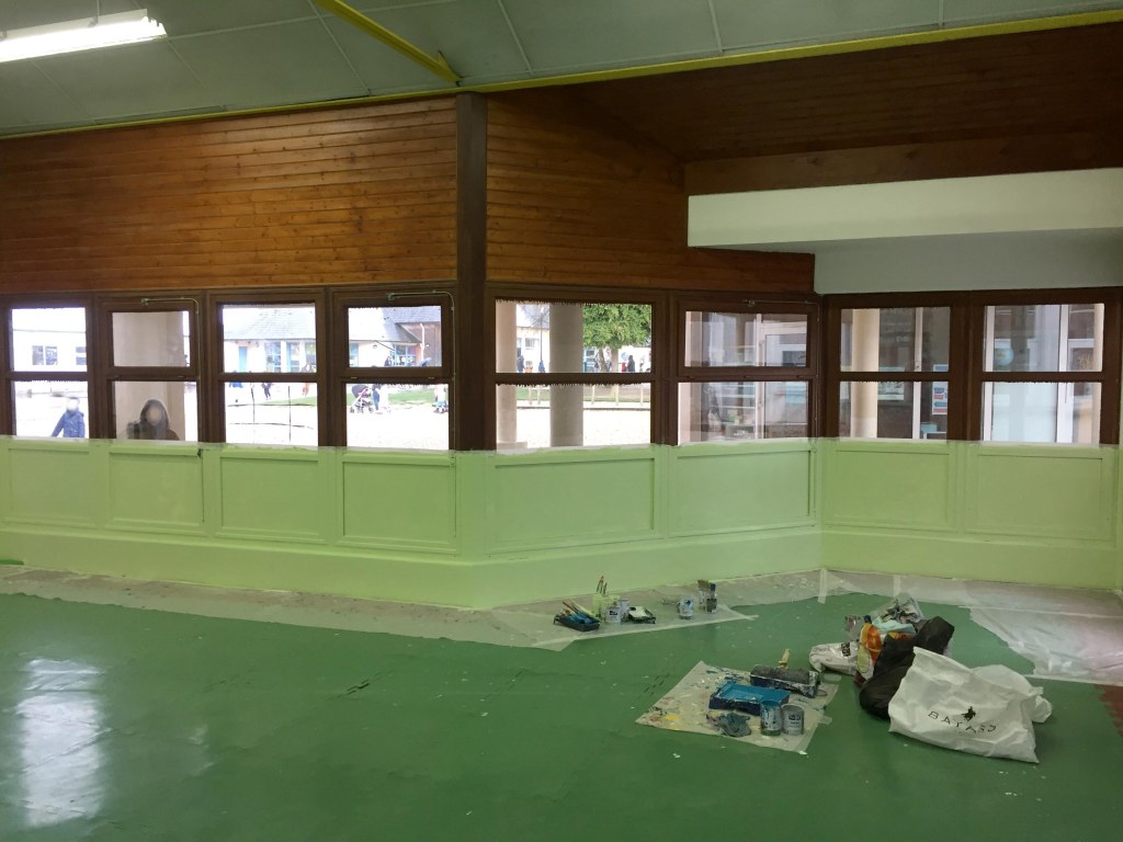 Tout d’abord la mairie de la commune nous a aidé à lancer les travaux: pendant les vacances on a repeint les parties oranges de la salle en blanc.