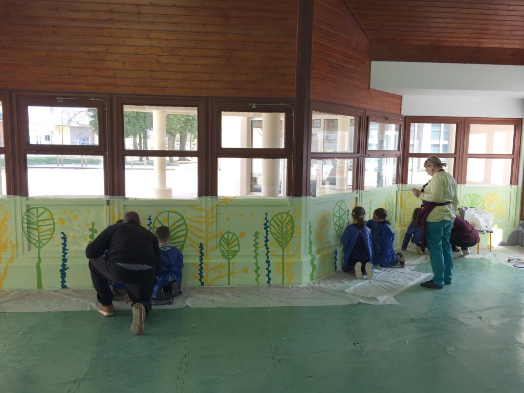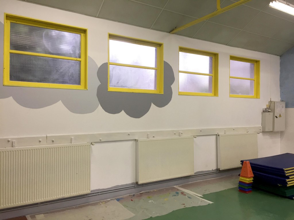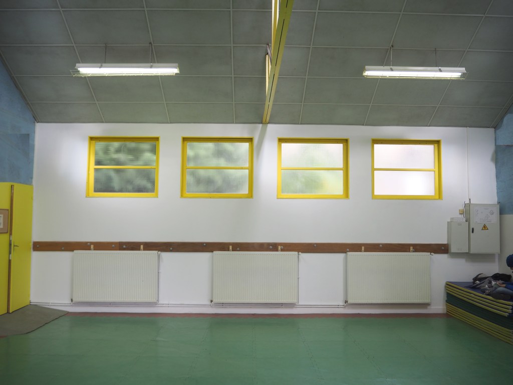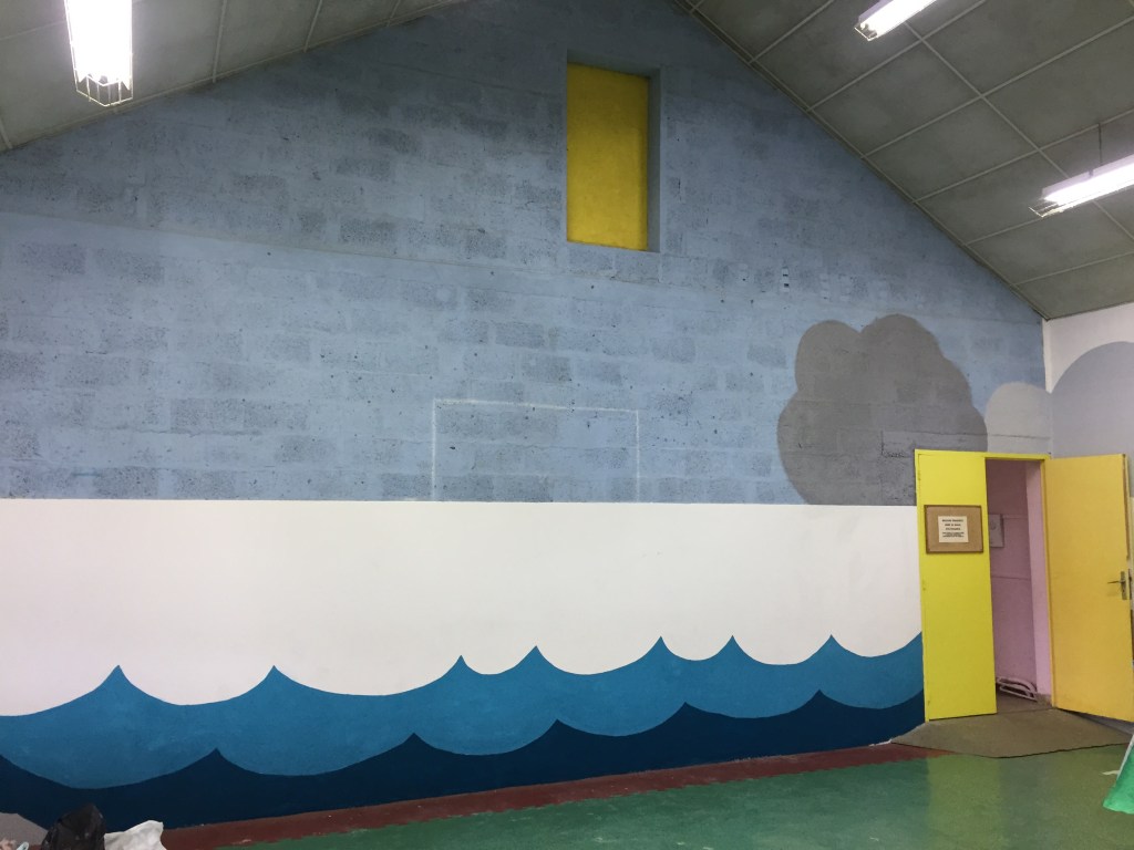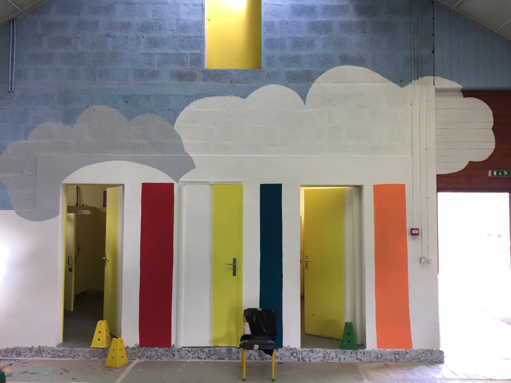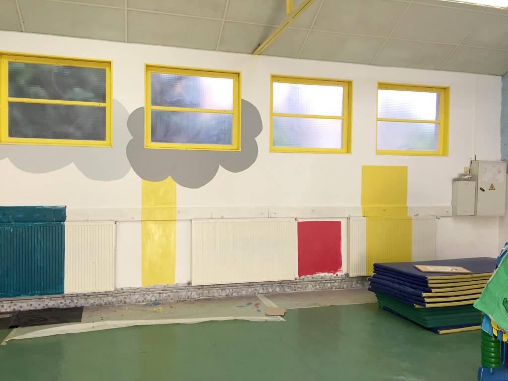 Tout d’abord la mairie de la commune nous a aidé à lancer les travaux: pendant les vacances on a repeint les parties oranges de la salle en blanc.