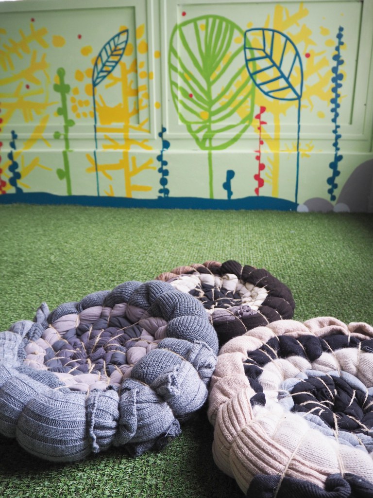 Une salle qui attend de nouvelles aventures! Nous avons même réussi à créer un petit coin de repos pour lire un livre ou faire une sieste avant de reprendre les cours de l’après-midi. Les coussins ont été réalisés à partir de vieux vêtements.